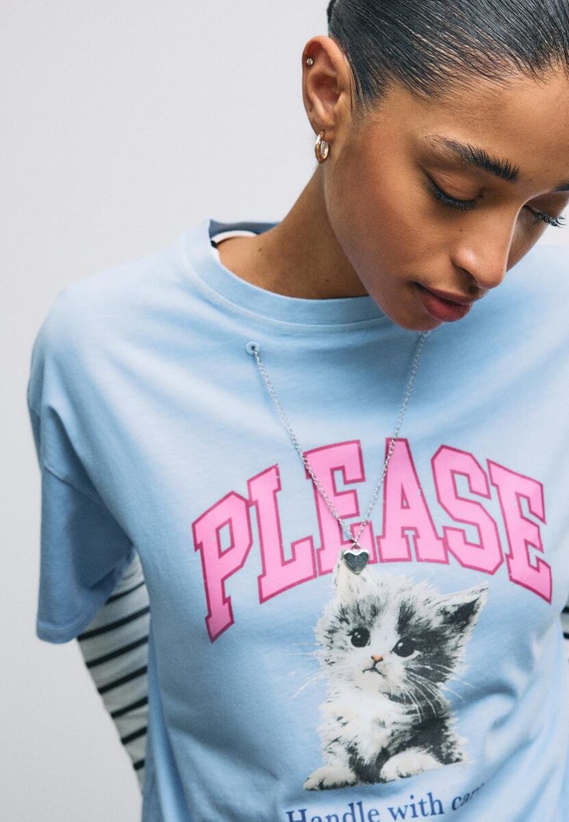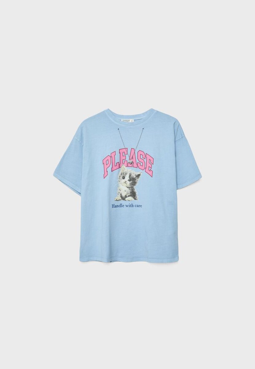 Rund hals, kortærmet T-skjorte. Har et trykk foran og en kjede med en avtakbar applikasjon. Tilgjengelig i flere farger.