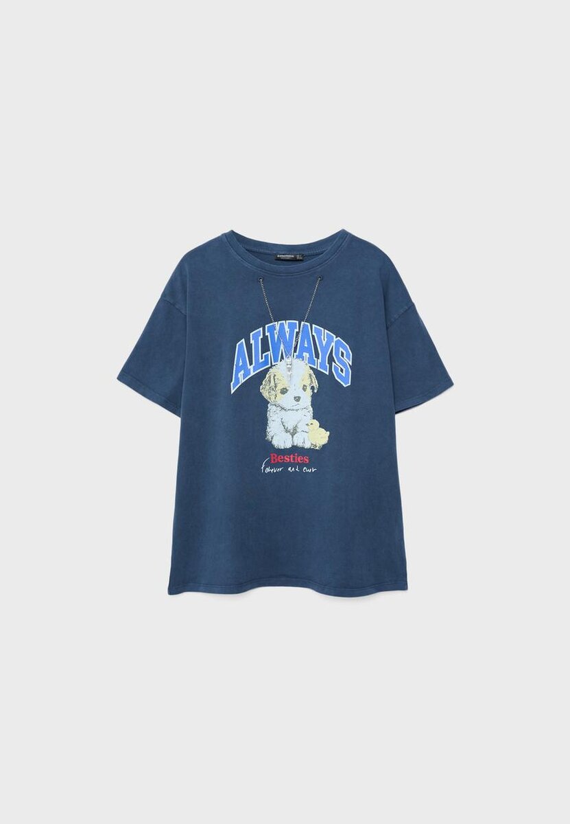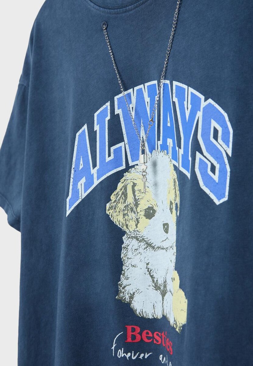 Rund hals, kortærmet T-skjorte. Har trykk foran og en kjede med avtakbar applikasjon. Tilgjengelig i flere farger.