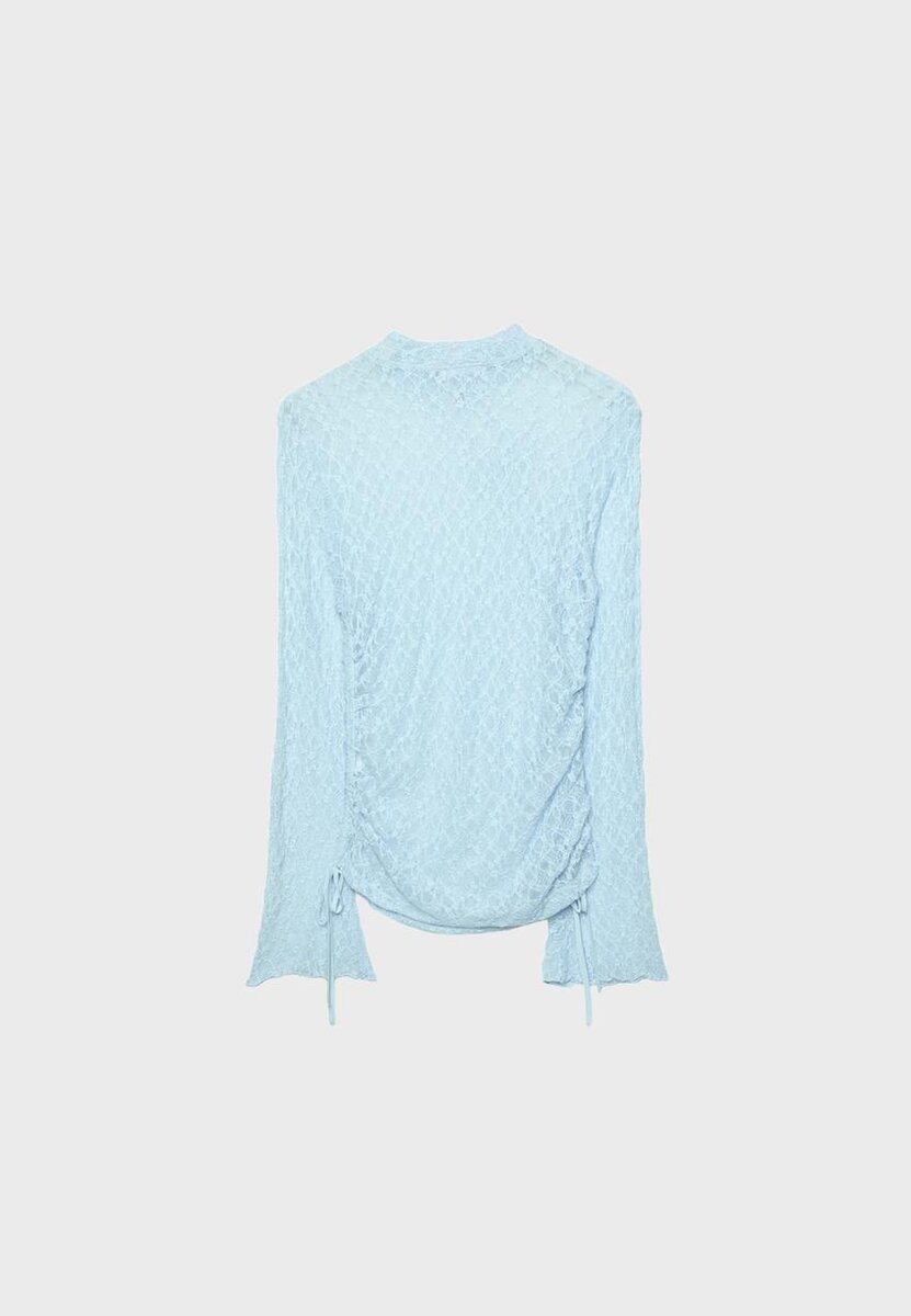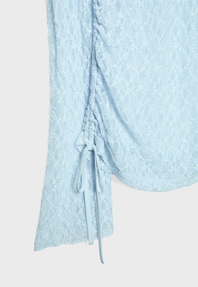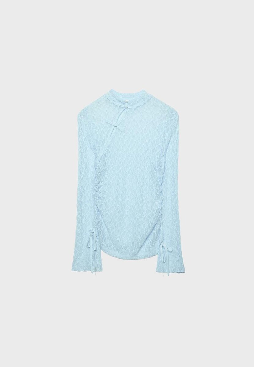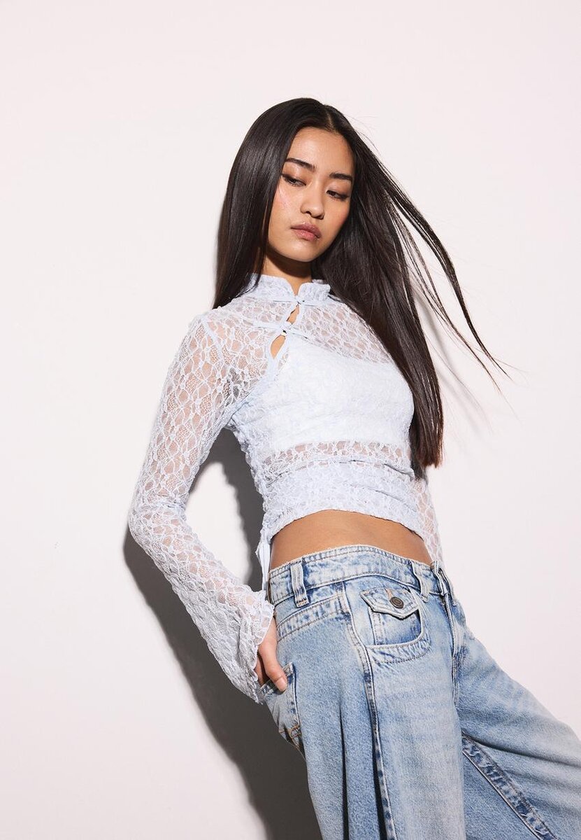 T-skjorte i blonder med stående krage i qipao-stil med knapper og lange ermer med bånddetaljer. Med rynkedetaljer i livet.