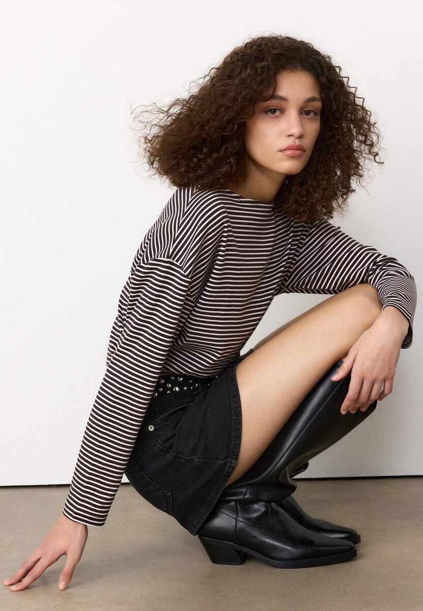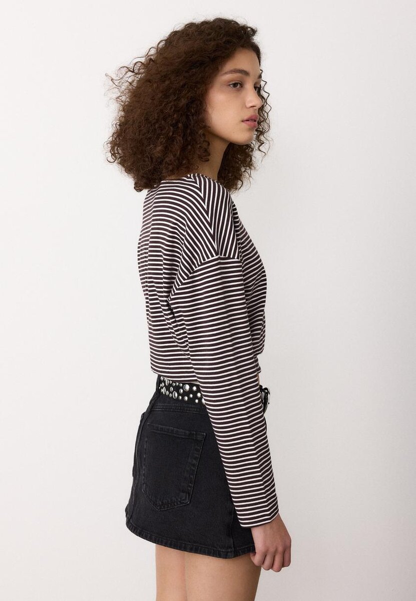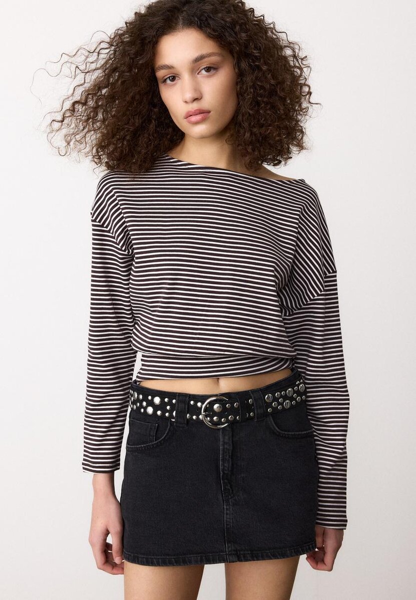 Langermet T-skjorte med båthals og stripete sjal fra Stradivarius for kun 25,9 $ Tilgjengelig i en begrenset periode. Mix to Win for kvinner – alltid på moten, kom inn og sjekk ut nå!