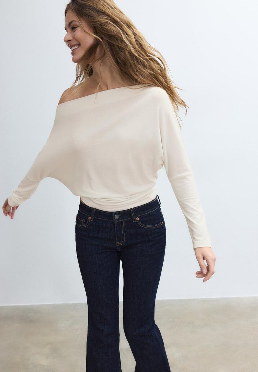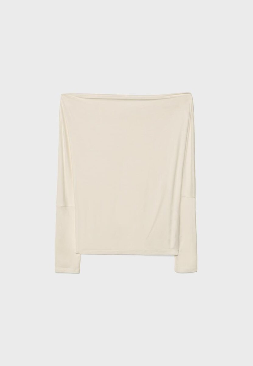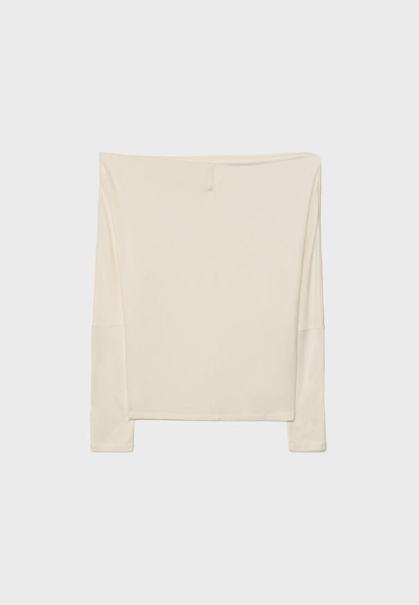 Flytende Soft-Touch-T-skjorte. Asymmetrisk halsutringning og lange ermer med mansjetter og bar skulder. Tilgjengelig i ulike farger.