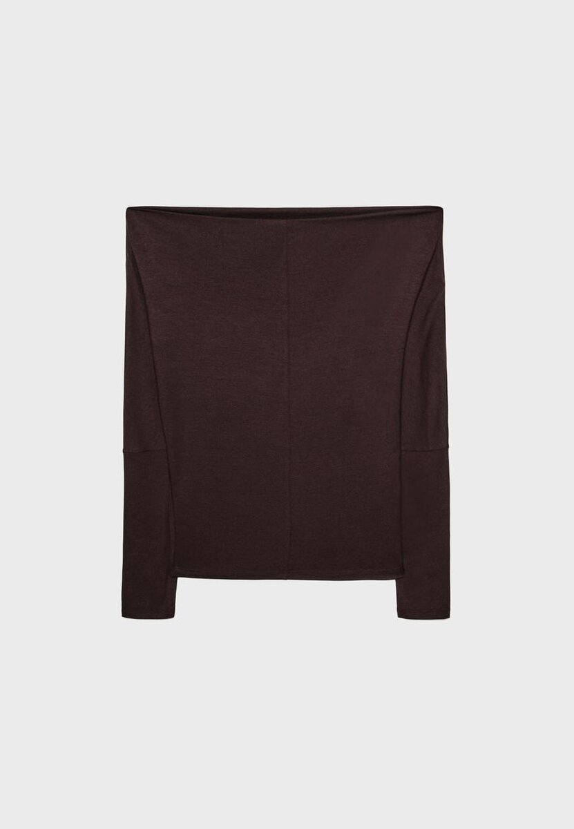 Flytende Soft-Touch T-skjorte. Asymmetrisk halsutringning og lange ermer med mansjetter og eksponerte skuldre. Tilgjengelig i ulike farger.