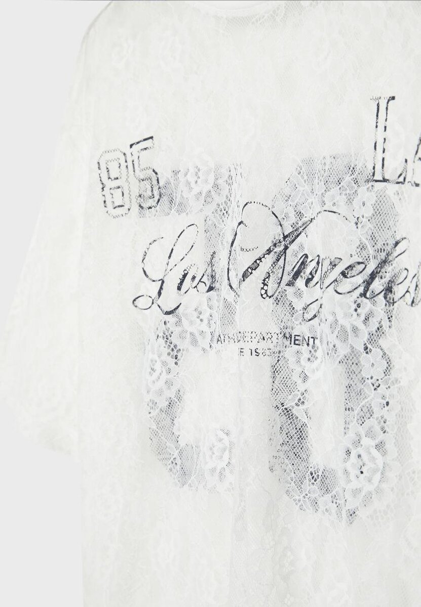 Oversize T-skjorte laget av blomstret blondestoff. Rund hals og vide ermer under albuen. Grafisk trykkdetalj på forsiden med teksten «Los Angeles».
