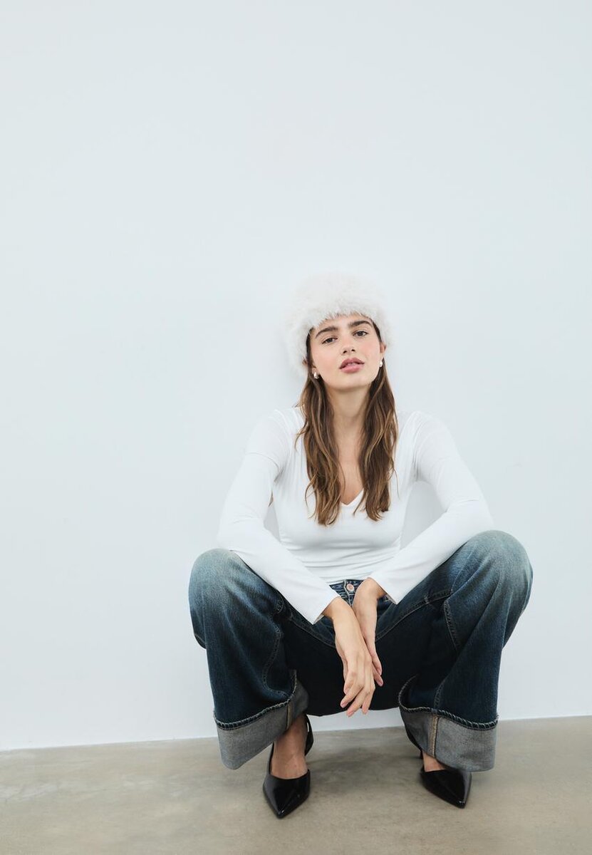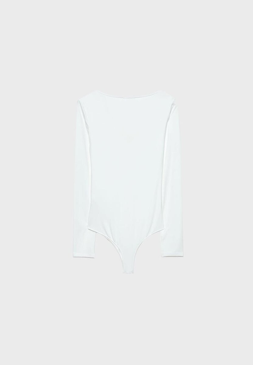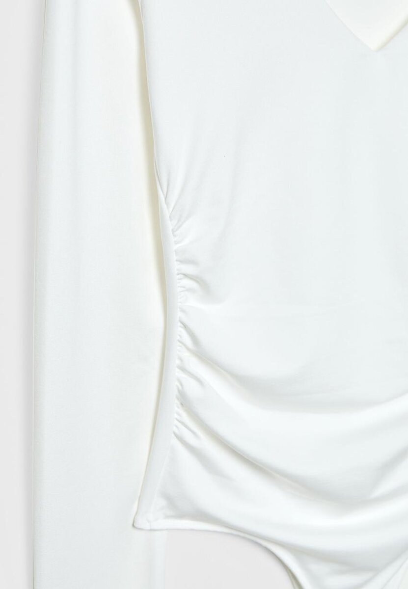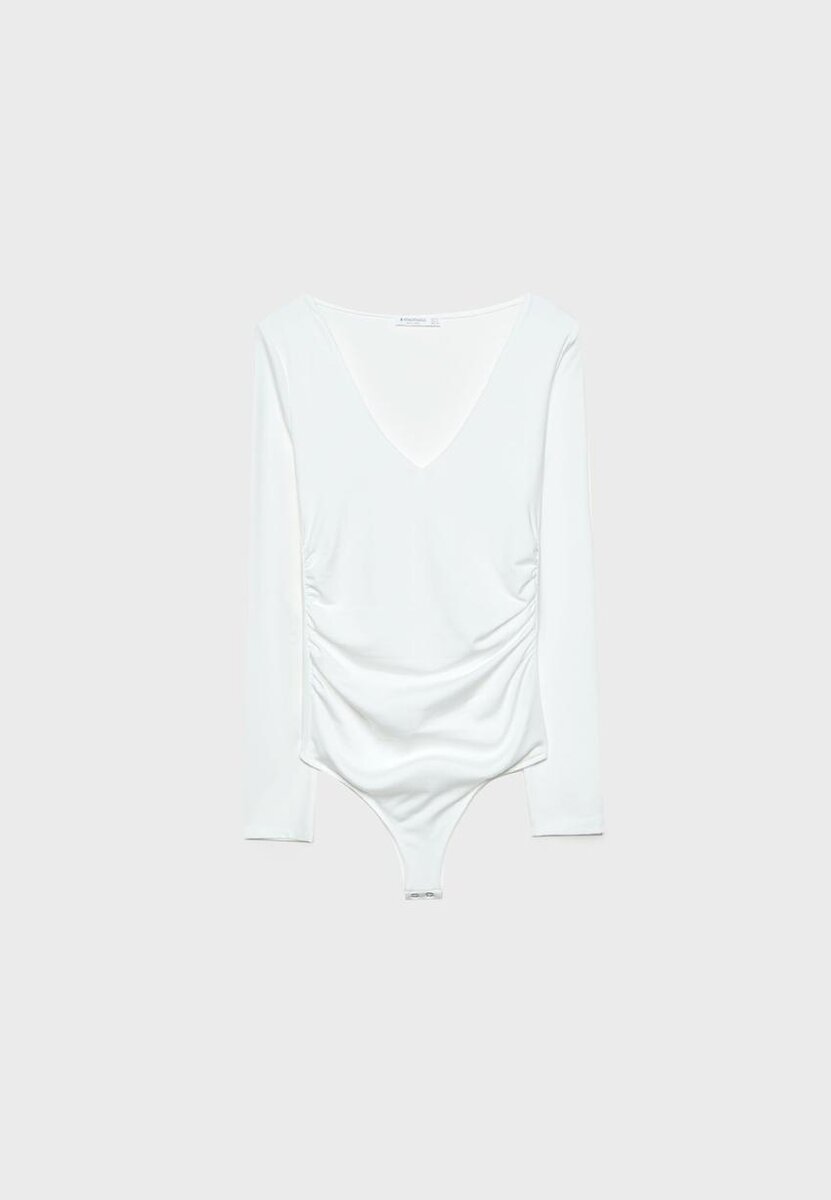 Tettsittende body med V-hals og lange ermer. Rynkedetaljer på sidene. Trykknapp-lukking nederst. Tilgjengelig i ulike farger.