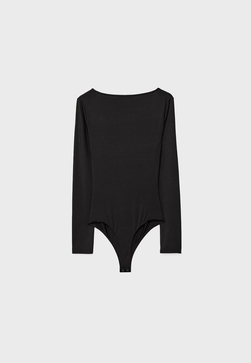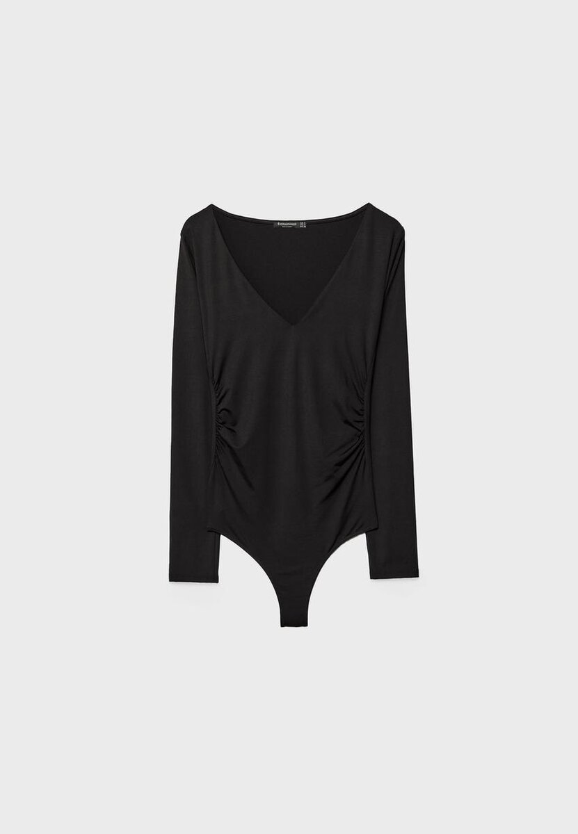 Tettsittende body med V-hals og lange ermer. Rynkedetaljer på sidene. Trykknapp-lukking nederst. Tilgjengelig i ulike farger.