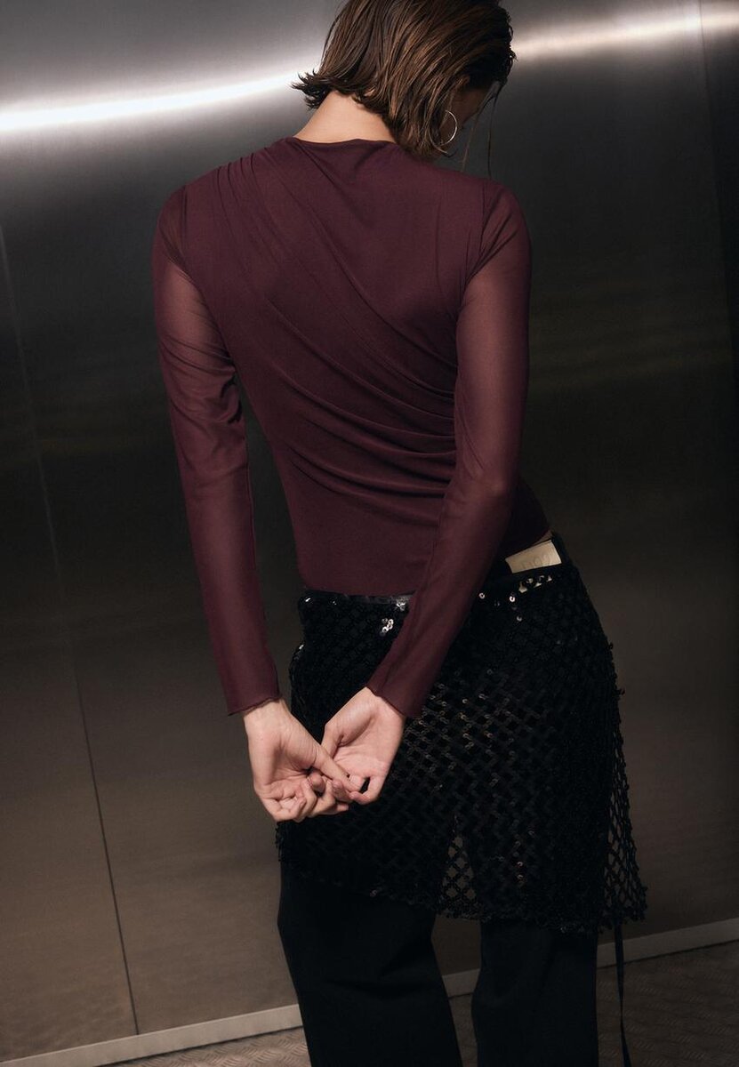 Tettsittende body laget av tyllstoff. Har høy hals og lange ermer med en halvtransparent finish. Detaljert med rynket stoff. Festes nederst med trykknapper. Tilgjengelig i ulike farger.