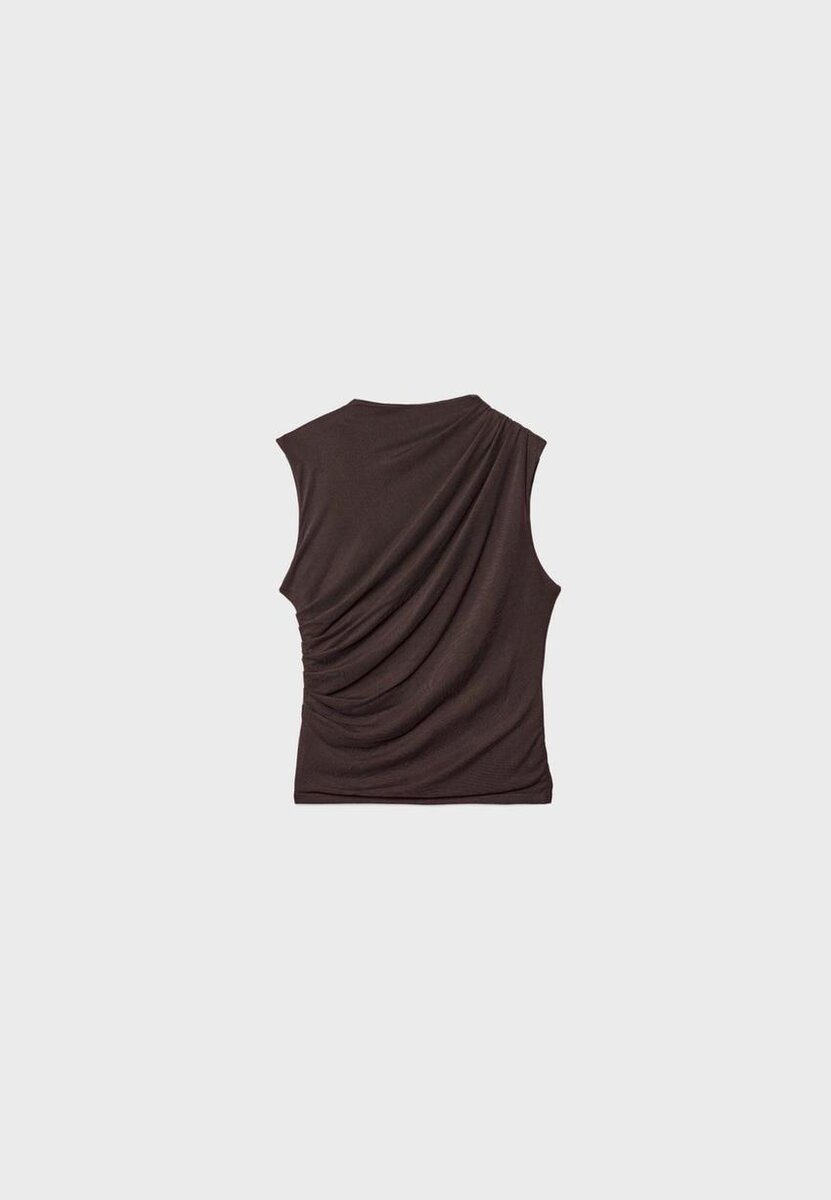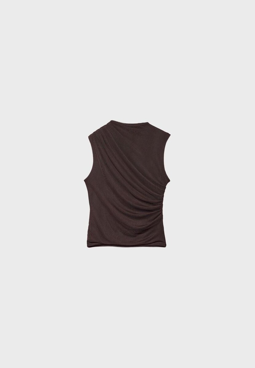 T-skjorte laget av tyllstoff med innerfôr. Har rund hals og ermeløs design. Detaljer i drapert stoff. Tilgjengelig i flere farger.