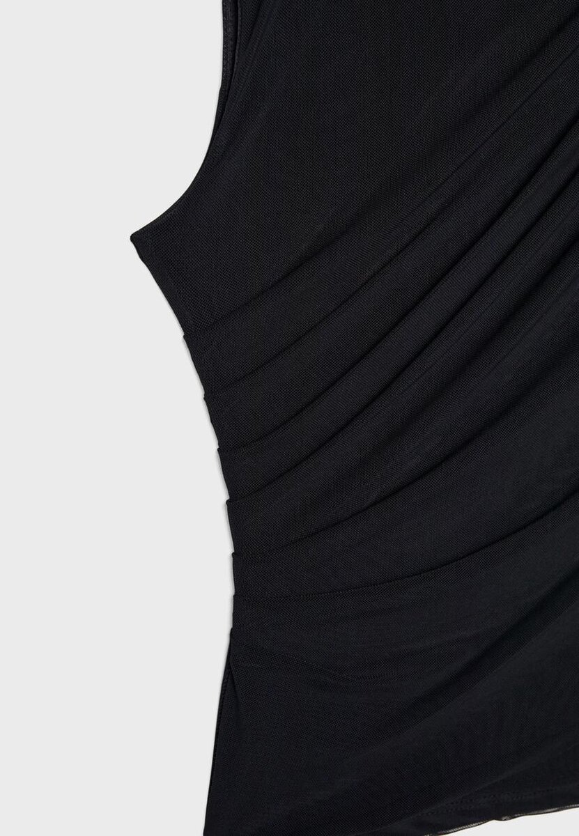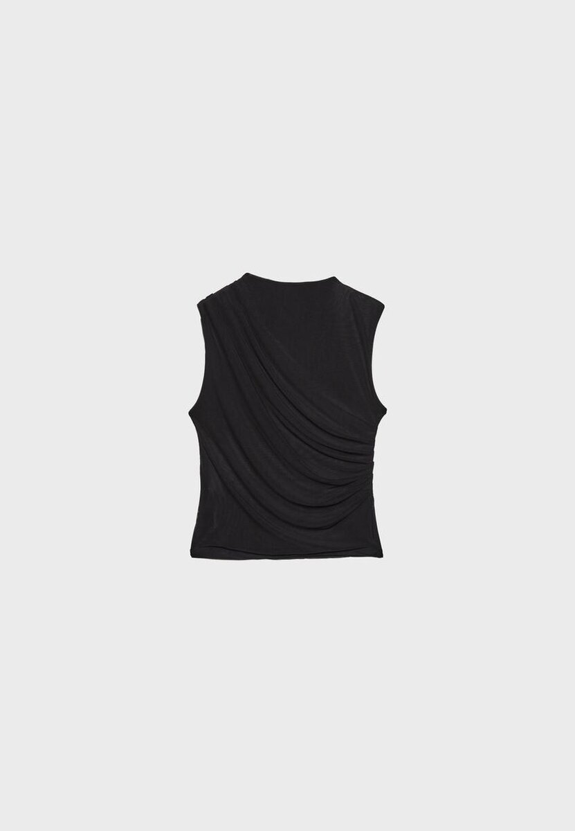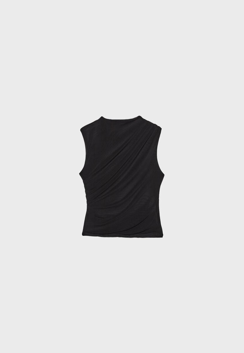 T-skjorte laget av tyllstoff med innerfôr. Har rund hals og ermeløs design. Detaljer i drapert stoff. Tilgjengelig i flere farger.