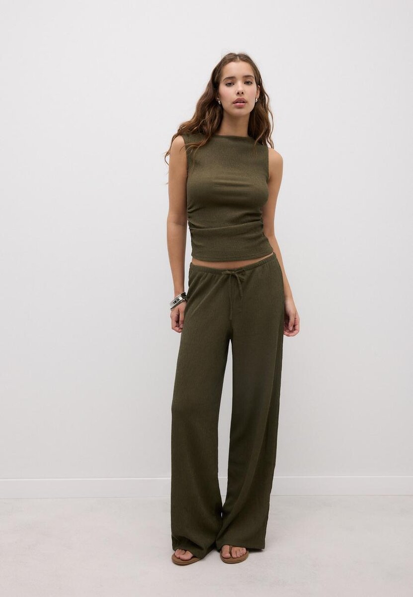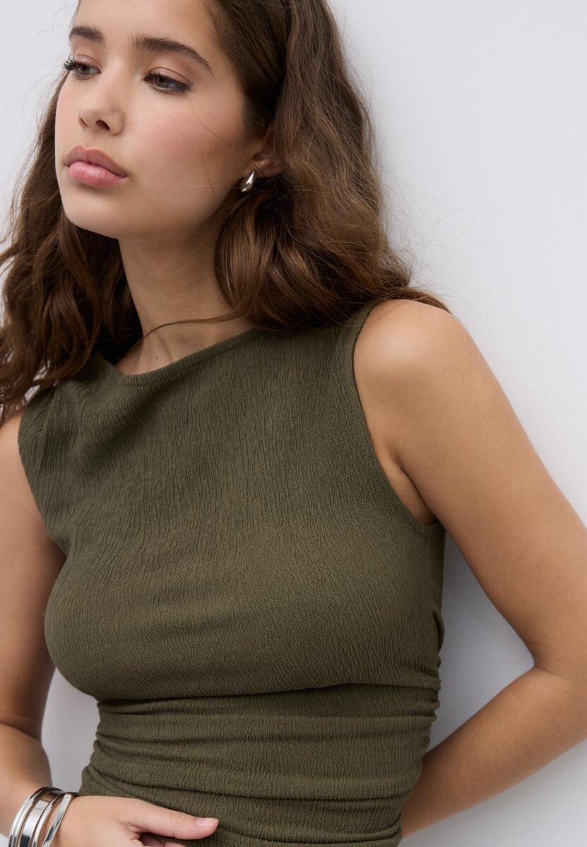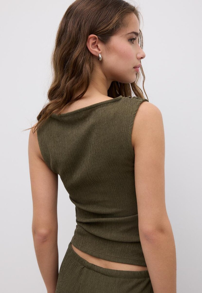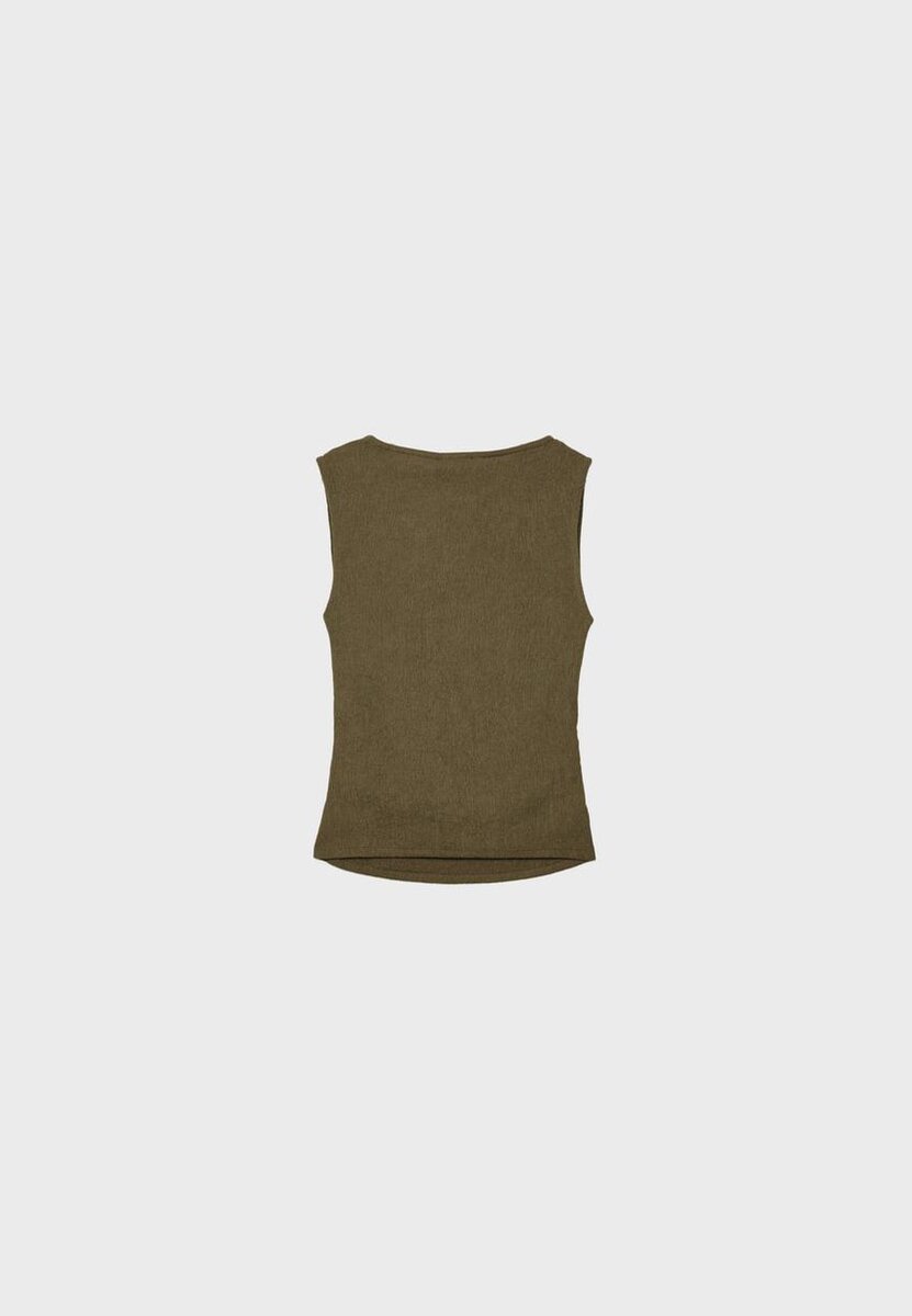 Strukturert topp laget av 19 % viskose. Med båthals og ermeløs design. Rynket detalj på sidene. Avsluttet med rett kant.