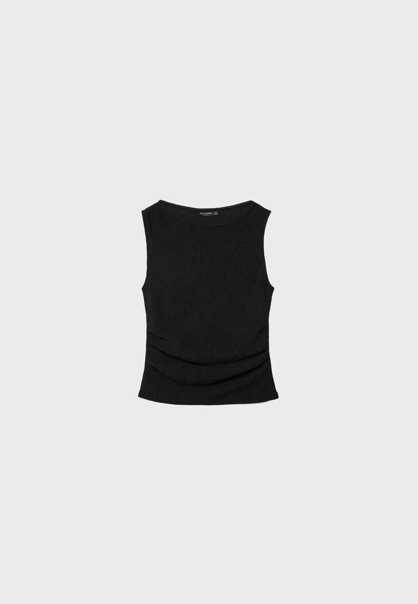 Teksturert topp laget av 19 % viskose. Med båthals og ermeløs design. Rynket detalj på sidene. Avsluttet med rett kant.