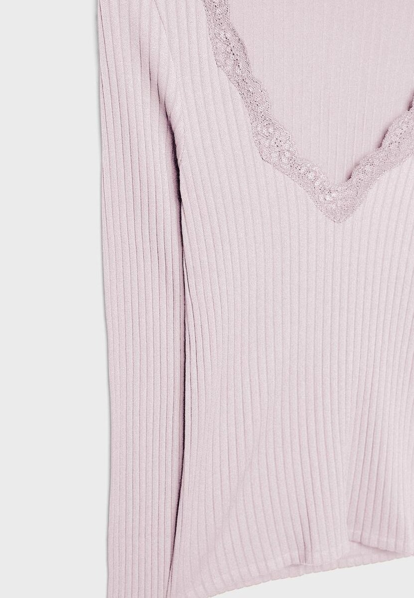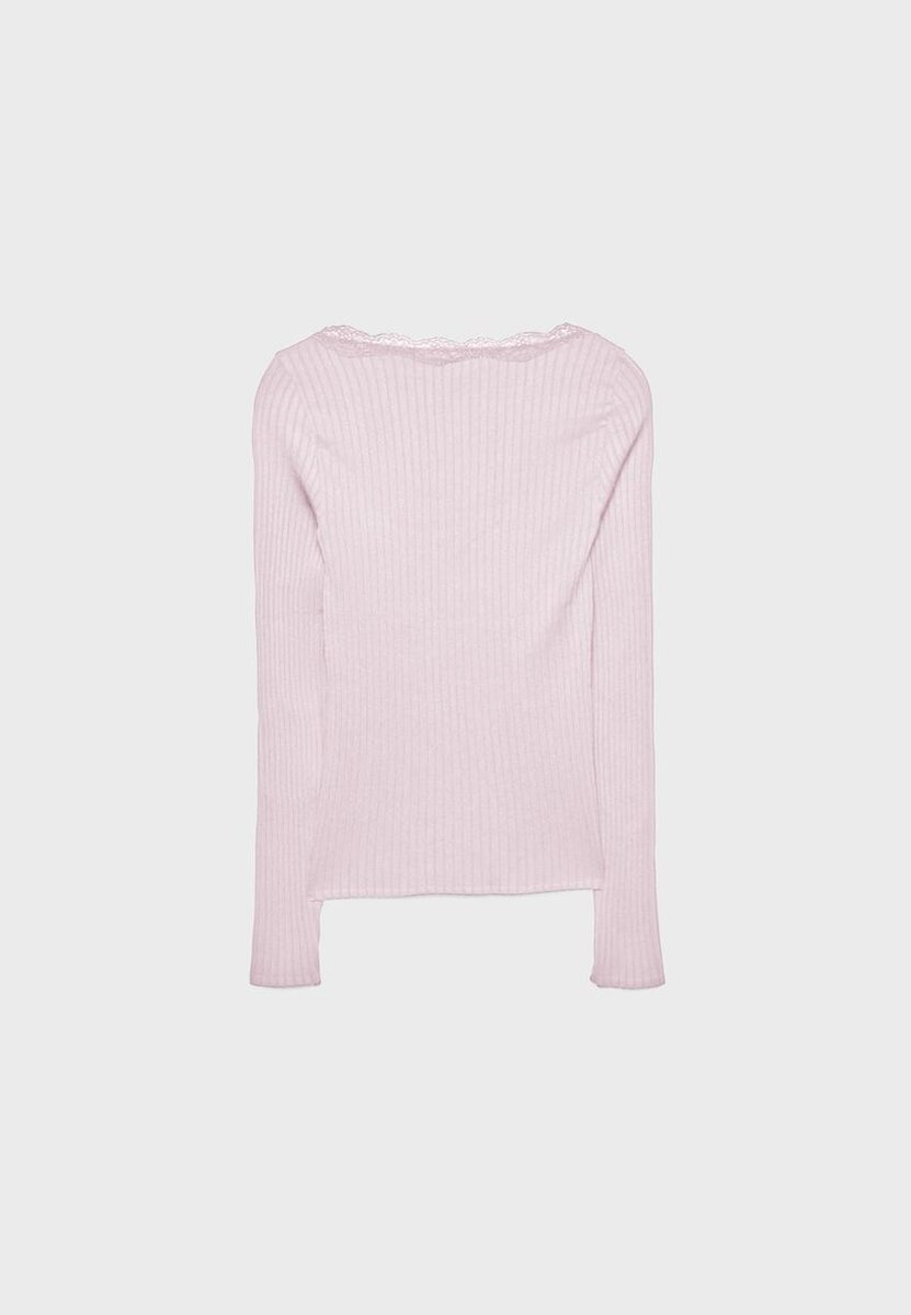 Tettsittende, seamless T-skjorte med V-hals, matchende blonderdetaljer og lange ermer. Tilgjengelig i flere farger.