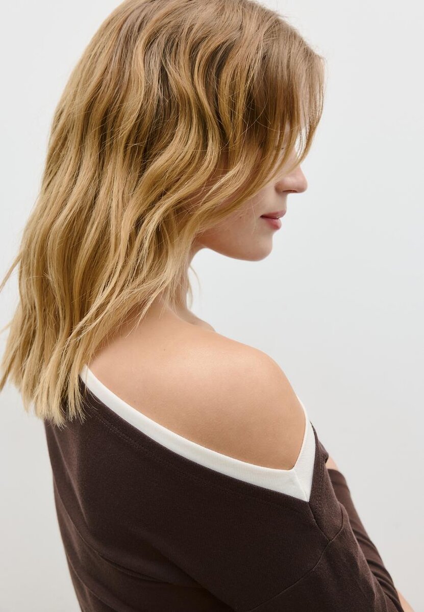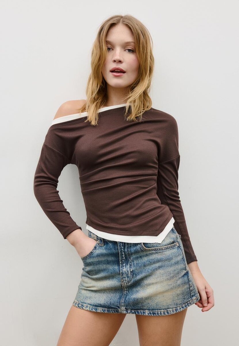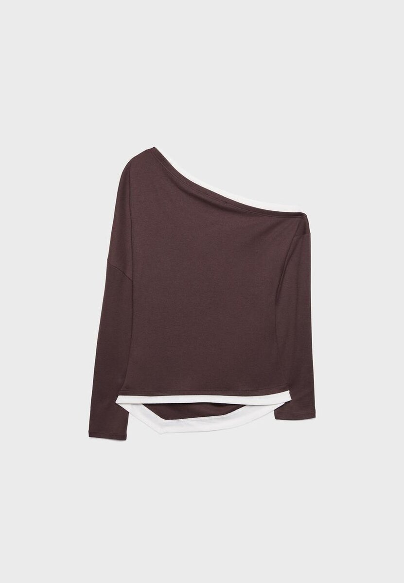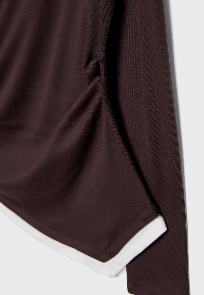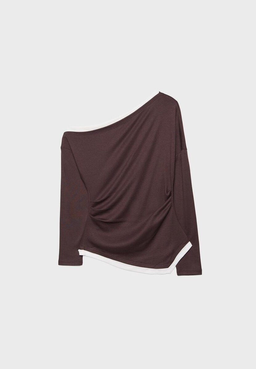 Asymmetrisk hals og langermet T-skjorte. Detalj med stoffoverlegg med kontrasterende dobbelteffekt.