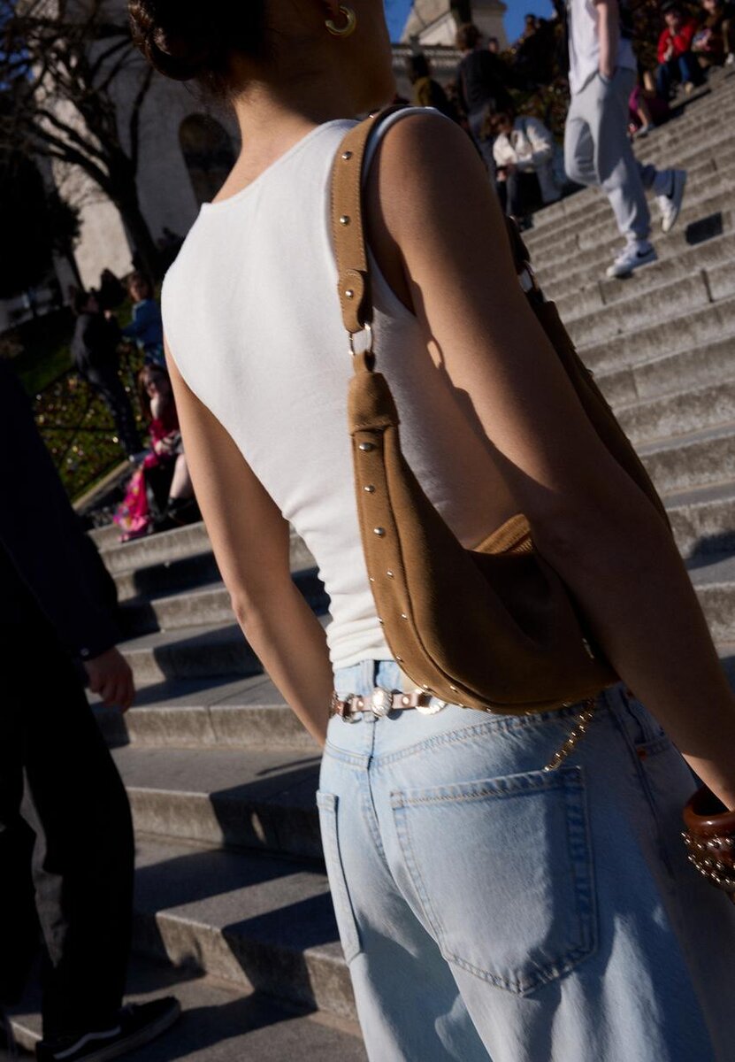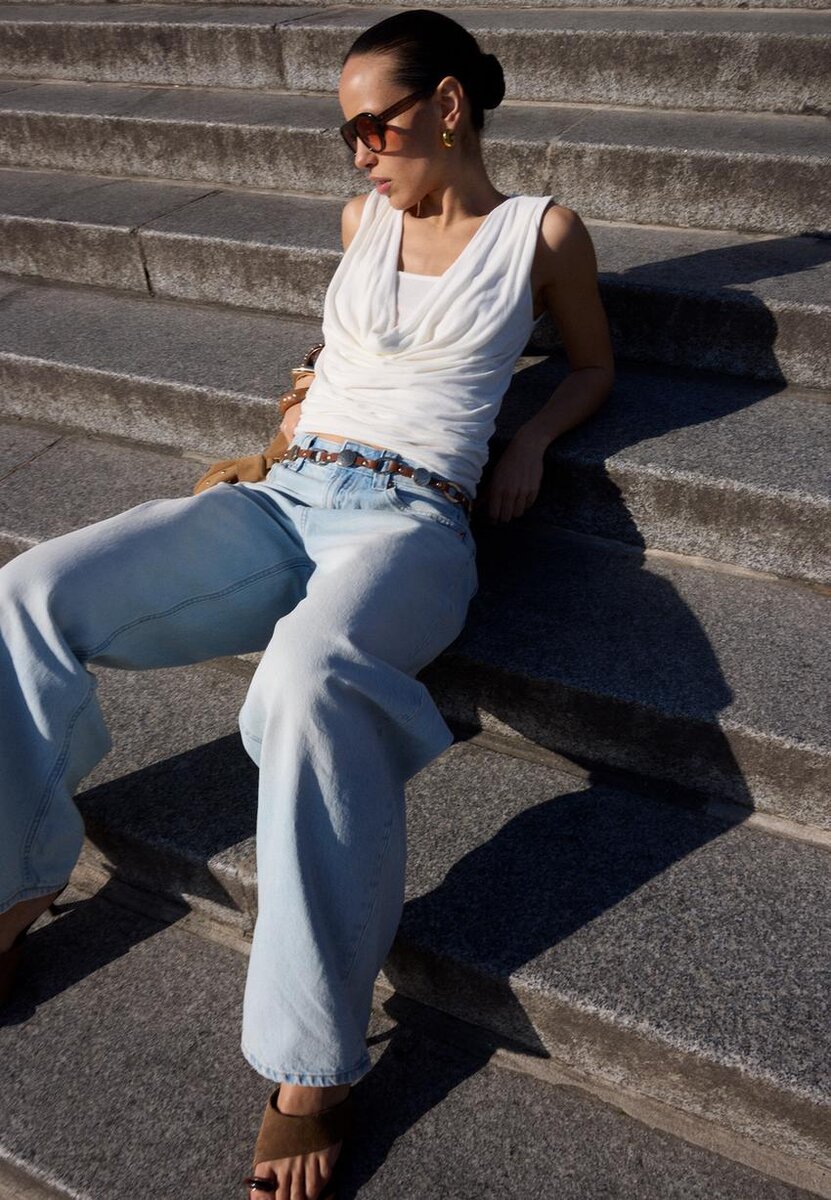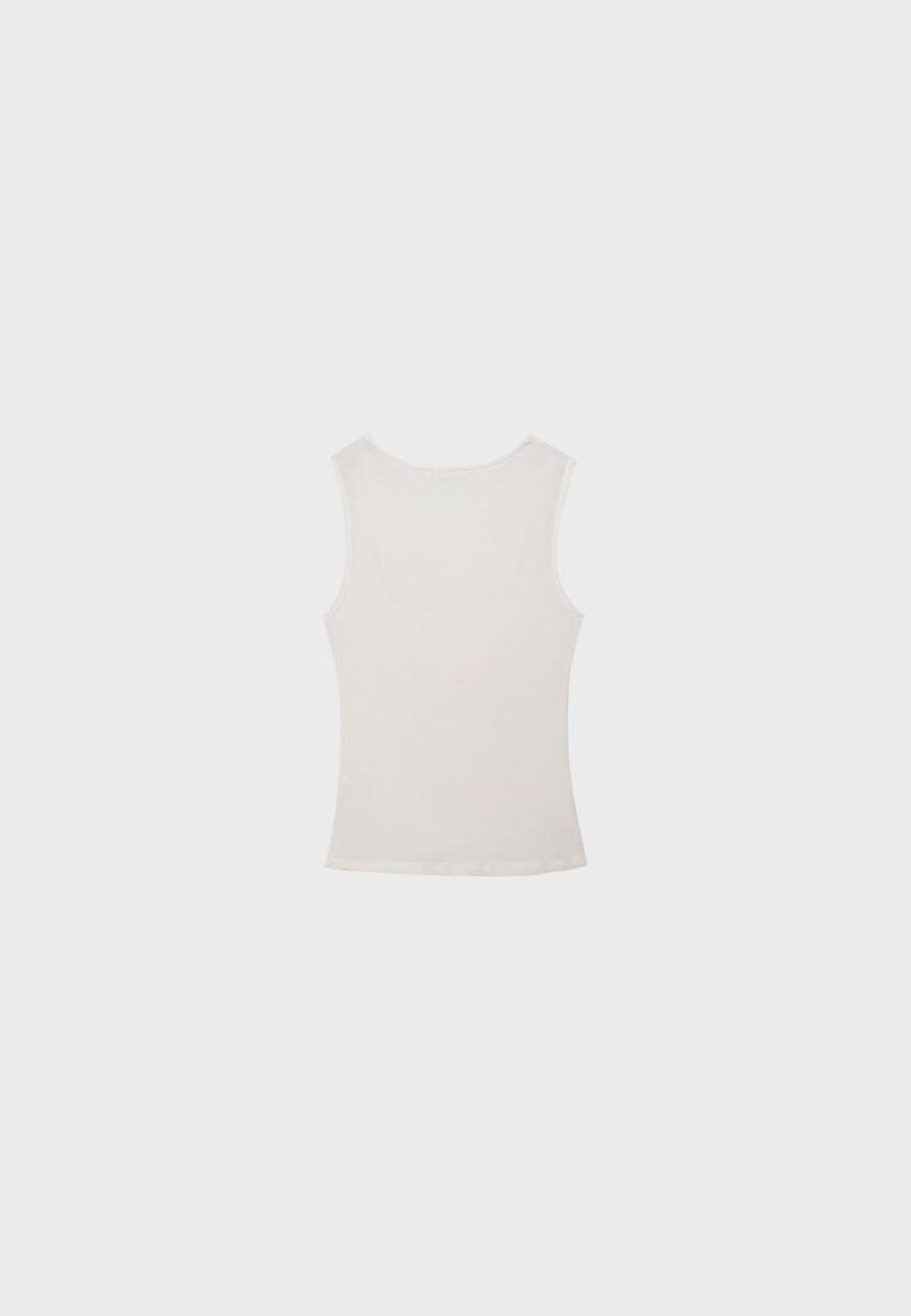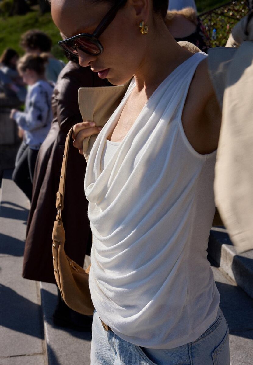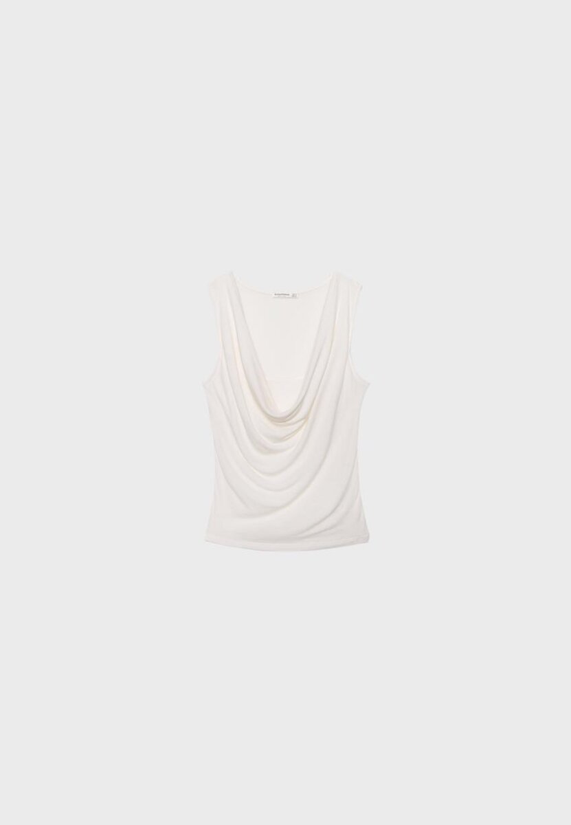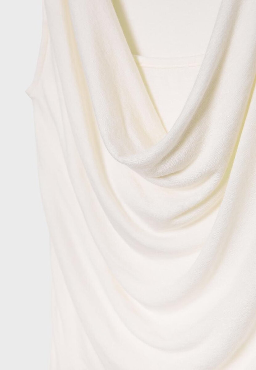 Ermeløs top med cowl-hals. Med detalj i to lag ved halsen. Rett kant.