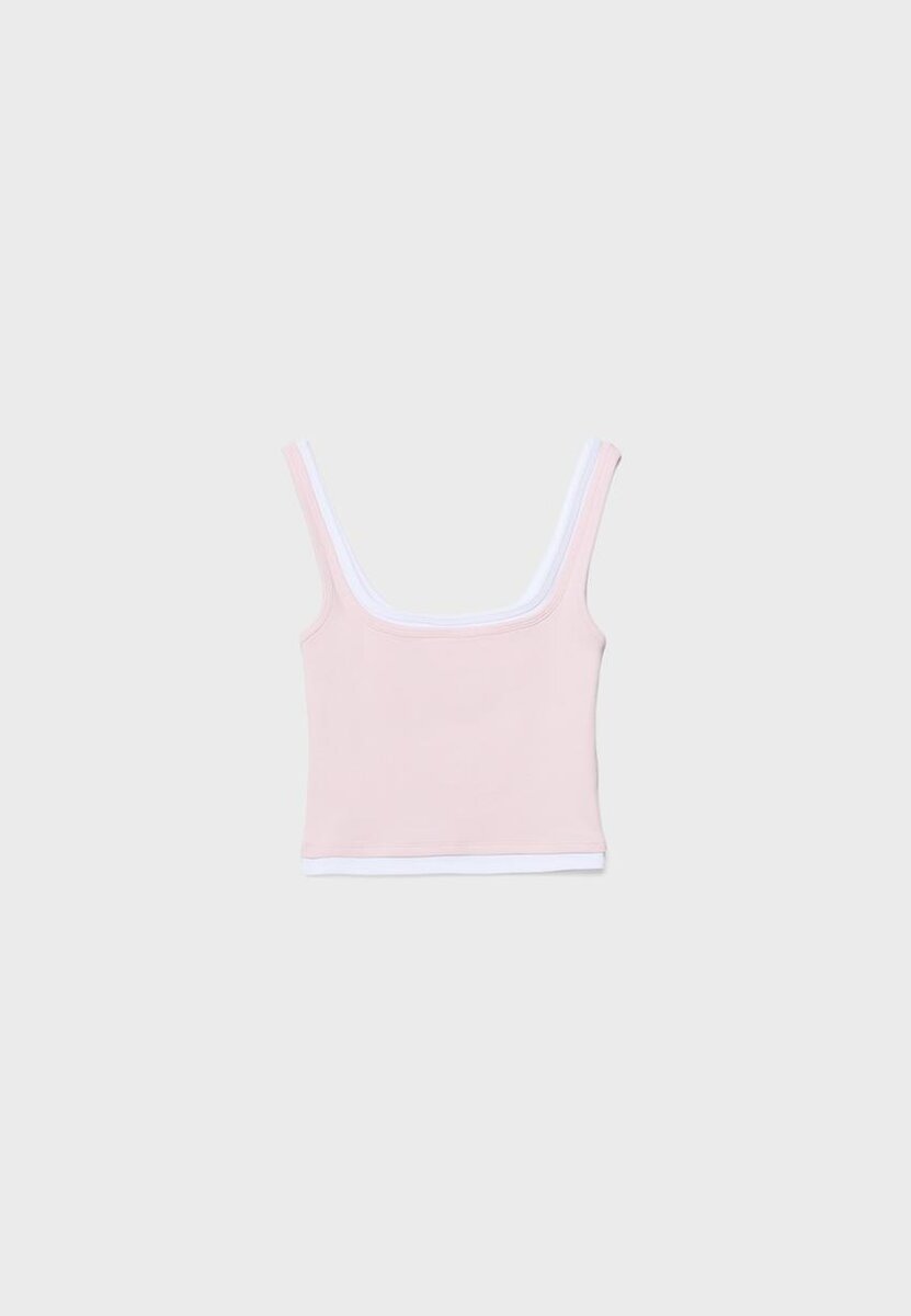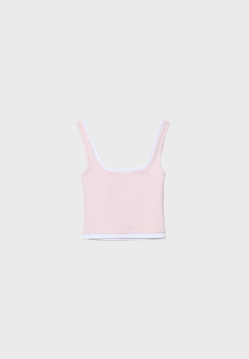 Top med firkantet hals og stropper. Med kontrasterende overlegg i to lag stoff. Tilgjengelig i flere farger.