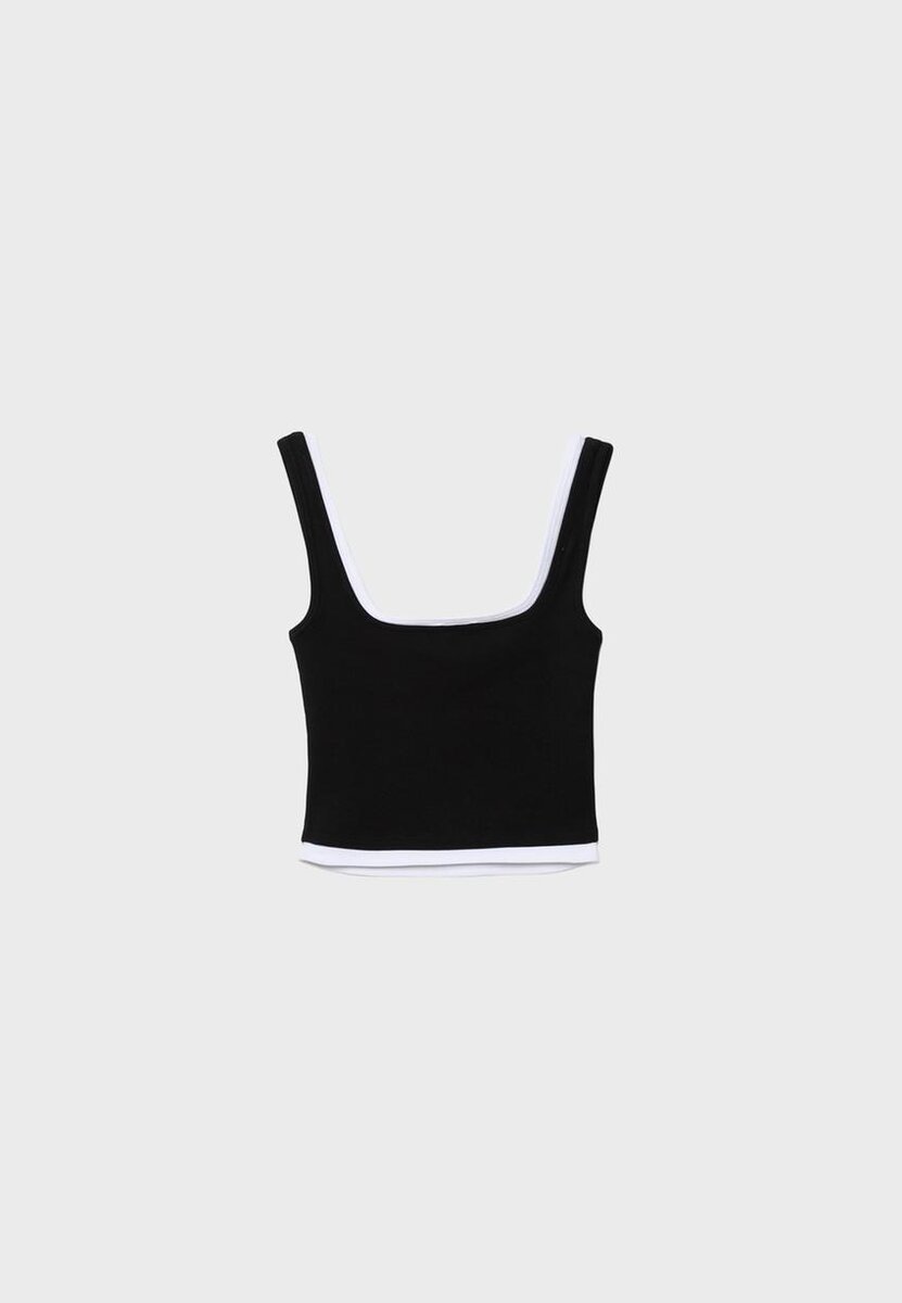 Top med firkantet hals og stropper. Med kontrastfarget overtrekk i stoff med to-delt effekt. Tilgjengelig i flere farger.