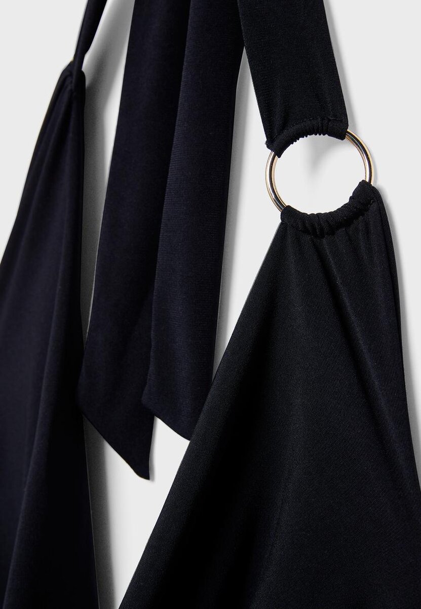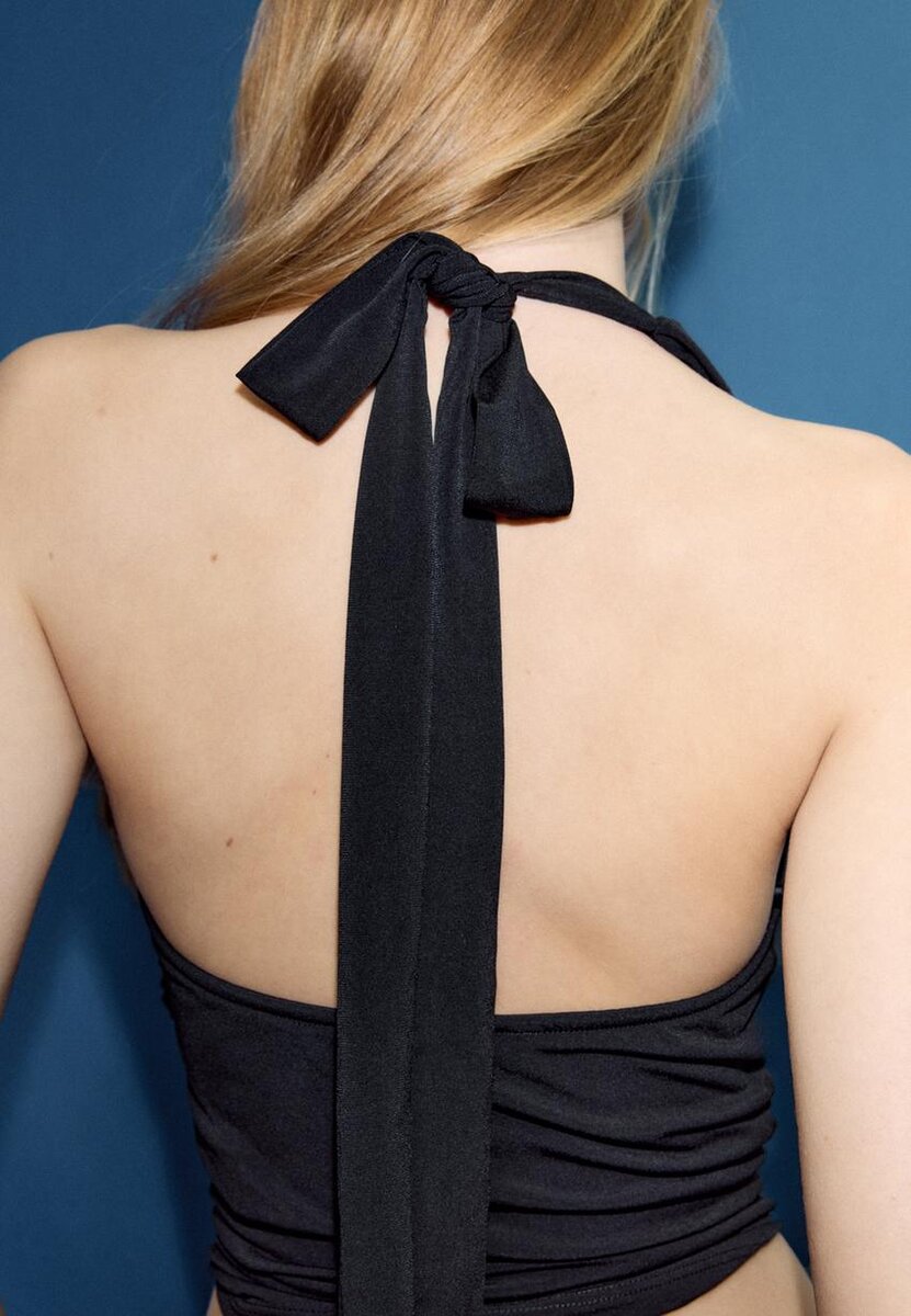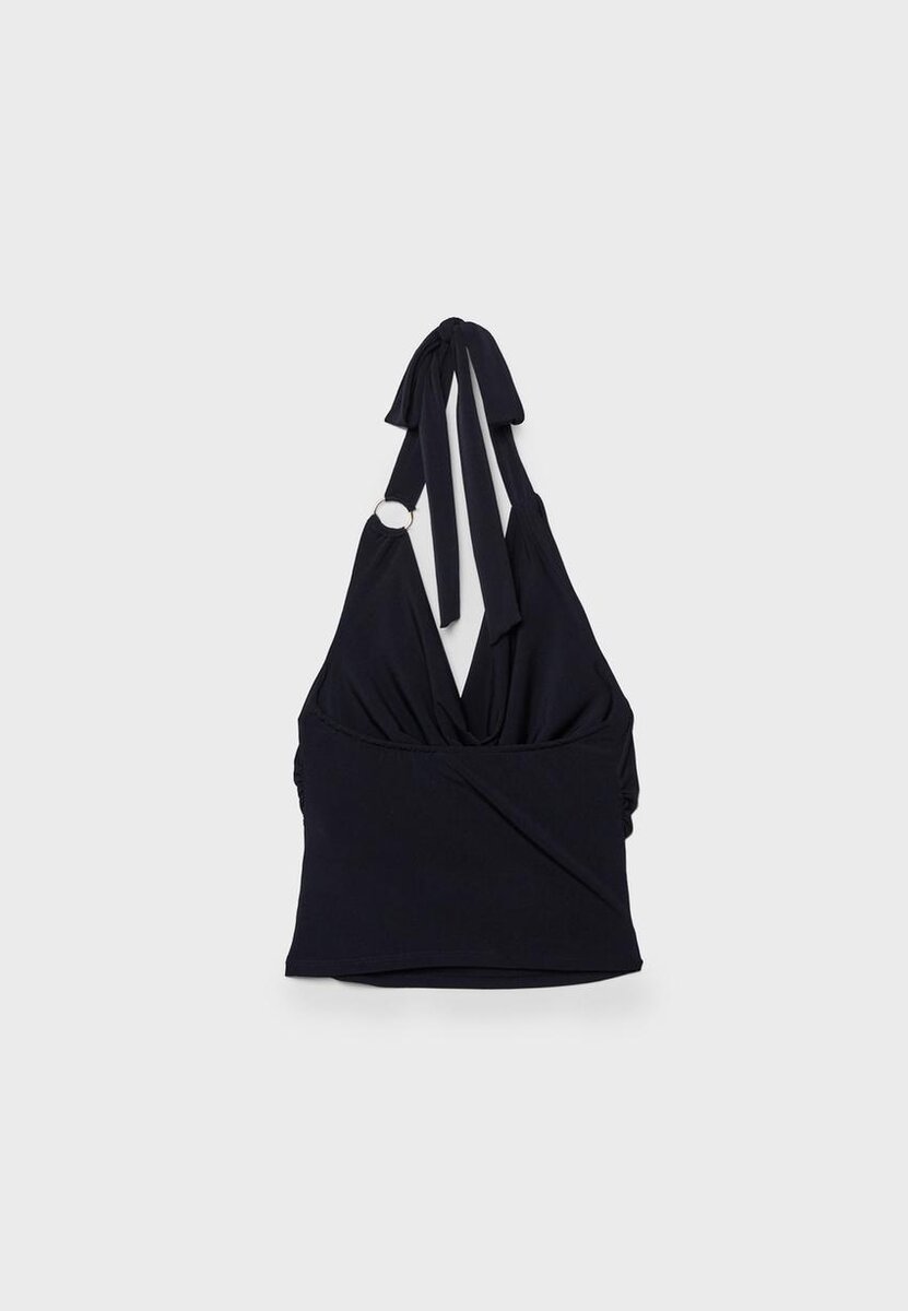 Tettsittende topp laget av elastisk stoff. Dyp V-hals som kan justeres med et bånd i nakken. Rynket stoff på sidene. Metallisk ringdetalj.