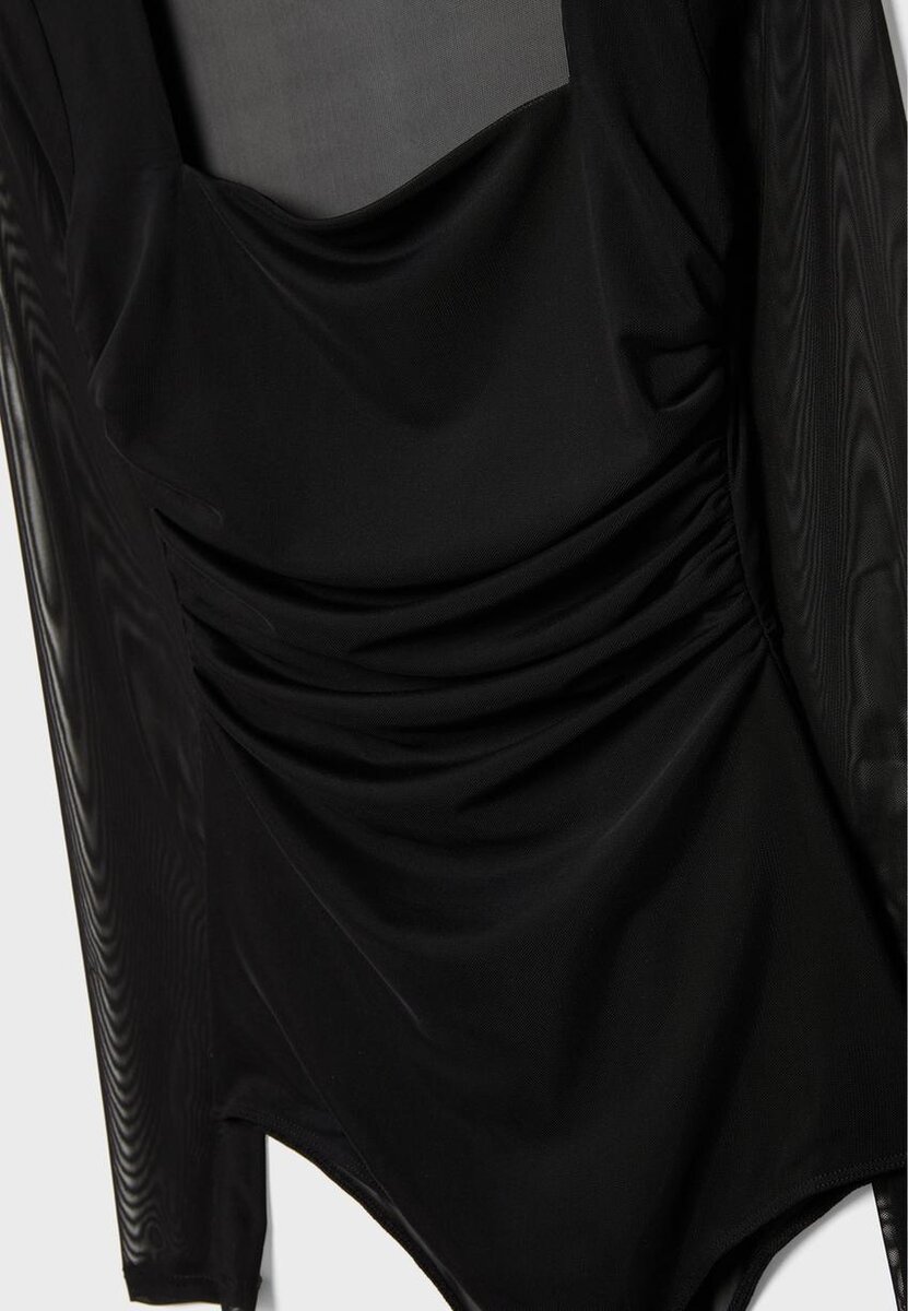 Tettsittende bodysuit laget av tyllstoff. Har firkantet utringning og lange ermer med en semi-gjennomsiktig finish. Rynket stoffdetalj på siden. Festes nederst med trykknapper. Tilgjengelig i ulike farger.