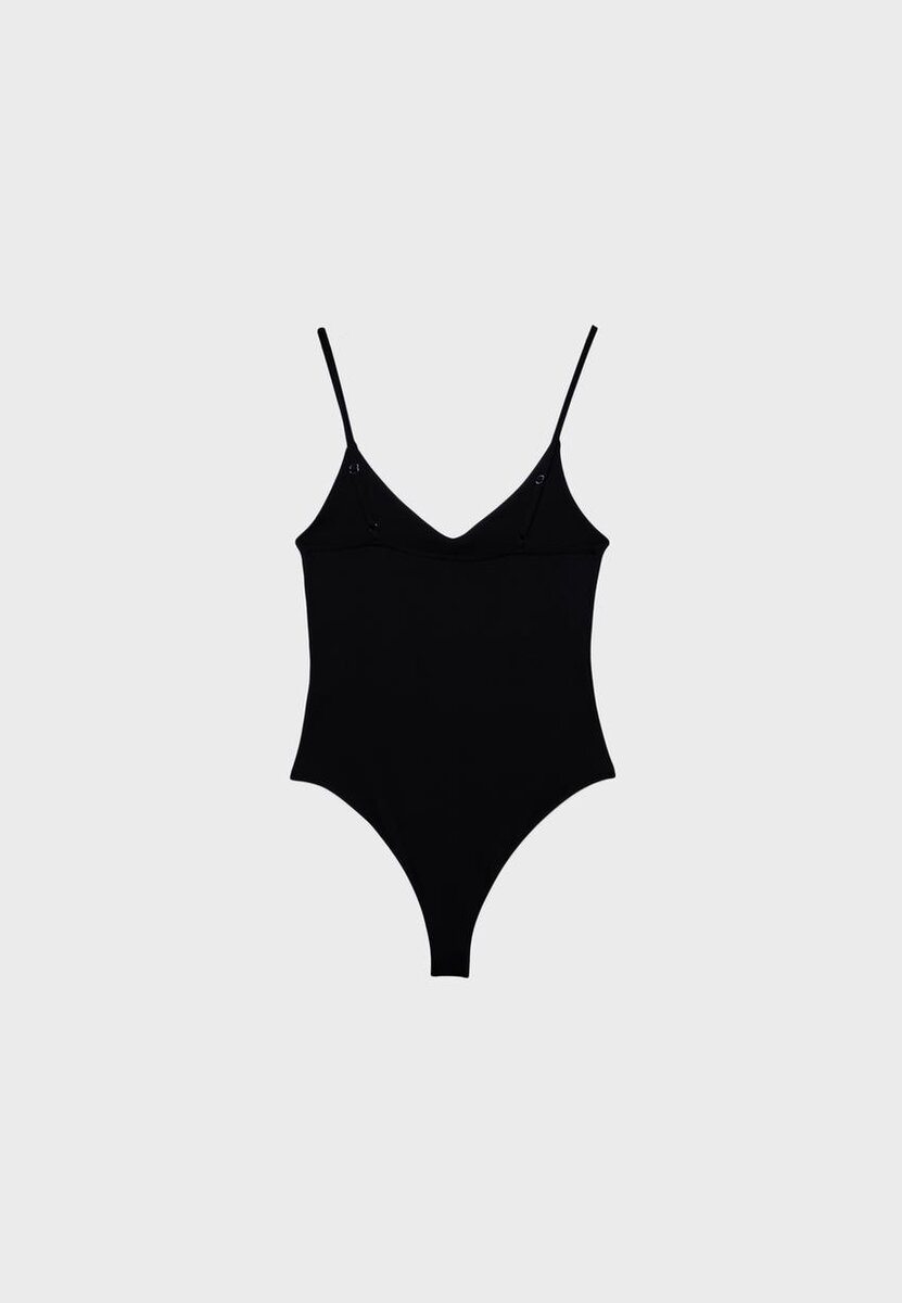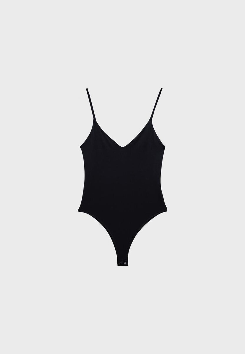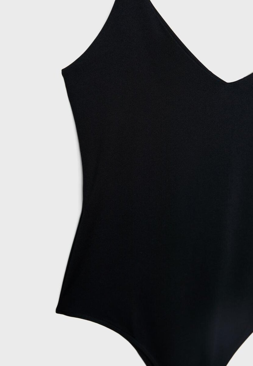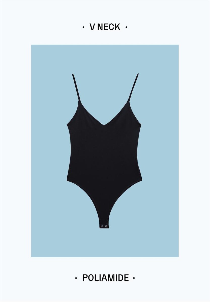 Tettsittende body med V-hals og tynne stropper. Har trykknapp-lukking nederst.