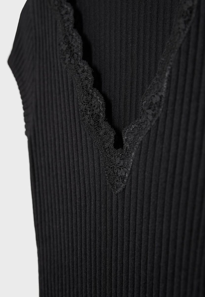 Tettsittende ribbet T-skjorte. V-hals med blonderdetaljer og korte ermer. Finnes i flere farger.