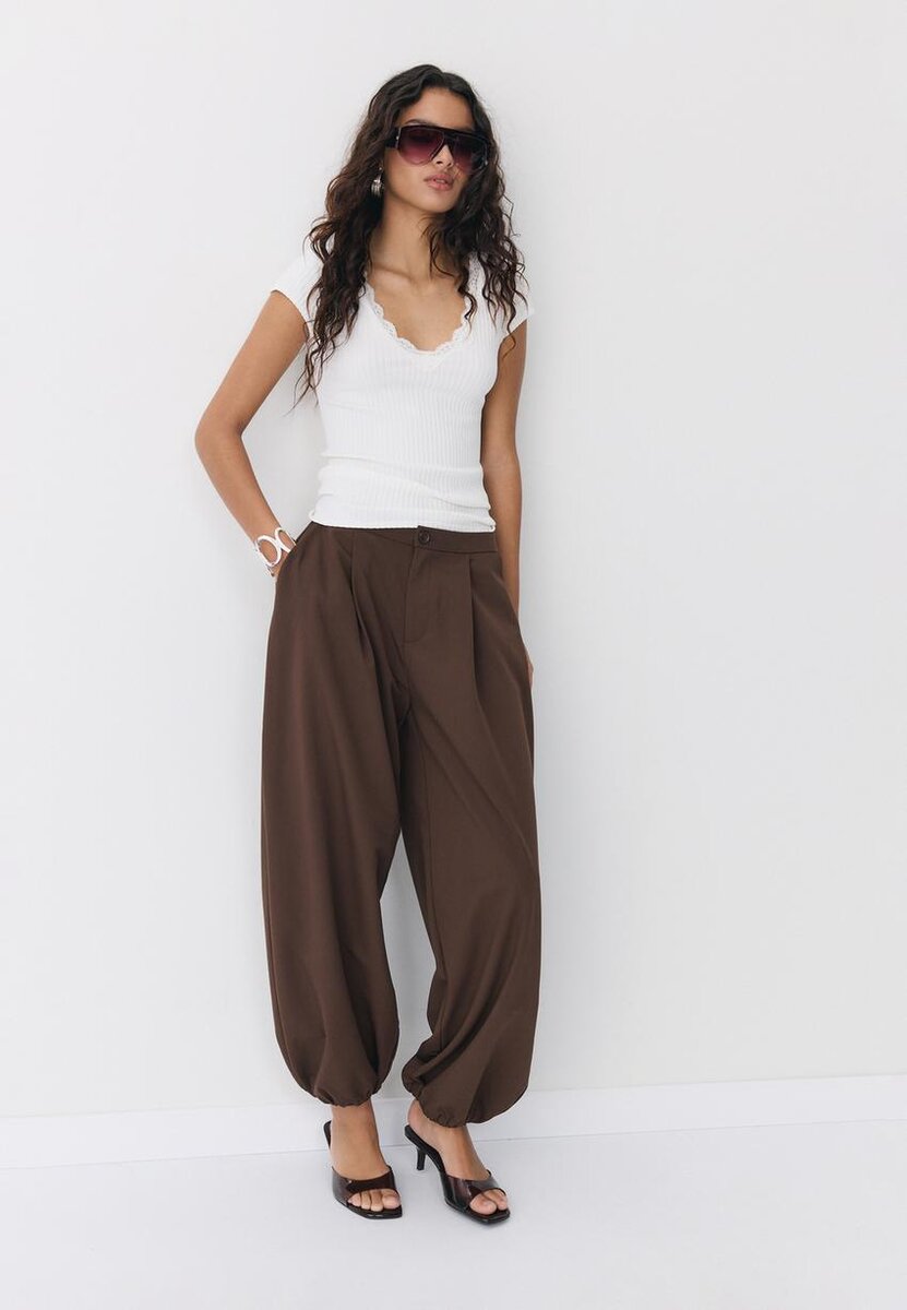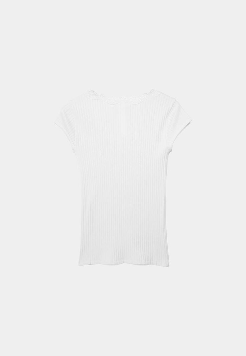Ribbet, tettsittende T-skjorte med V-hals og blonderdetaljer. Korte ermer. Tilgjengelig i en rekke farger.