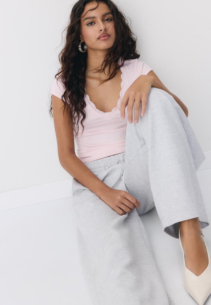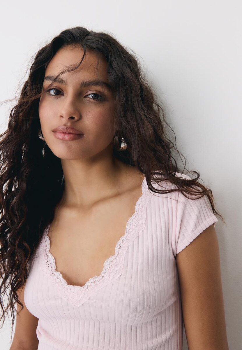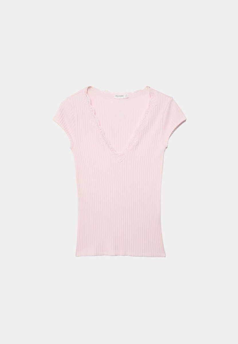 V-hals T-skjorte med blonder og korte ermer hos Stradivarius for kun 25,9 $ Tilgjengelig i en begrenset periode. Mocacos Nuevo for kvinner Alltid på moten, kom inn og oppdag det nå!