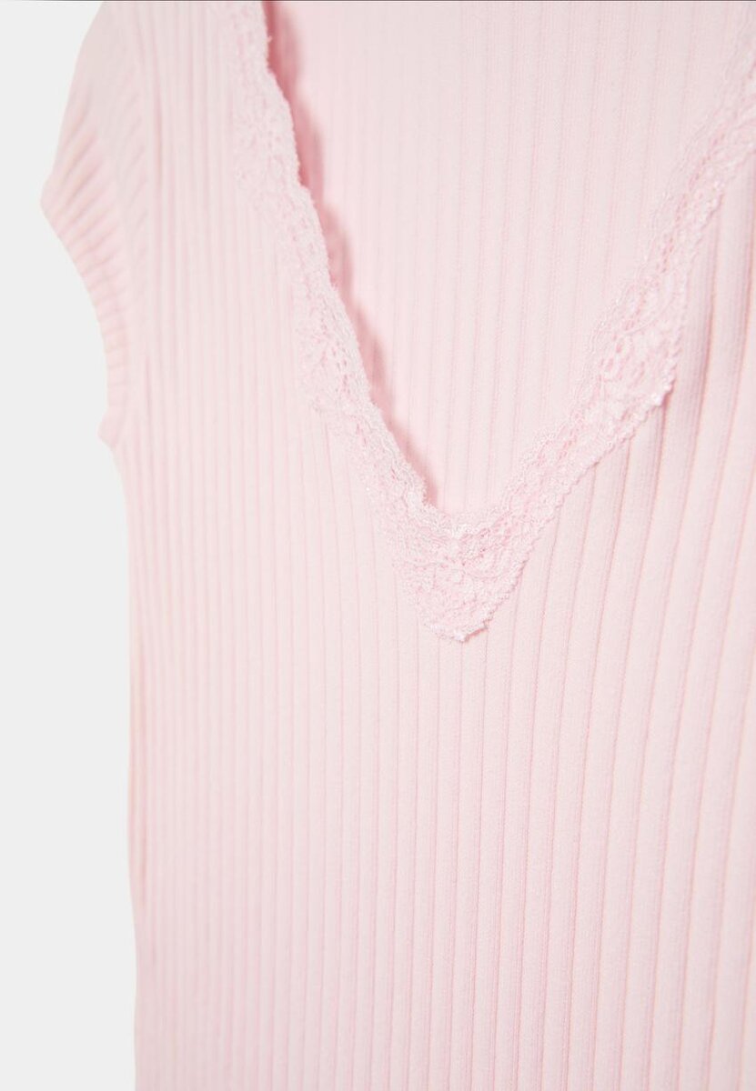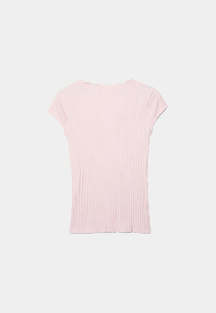 Tettsittende ribbet T-skjorte. V-hals med blonderdetaljer og korte ermer. Tilgjengelig i flere farger.