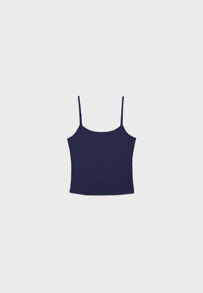 Tettsittende topp med rund hals og tynne, justerbare stropper. Tilgjengelig i flere farger.