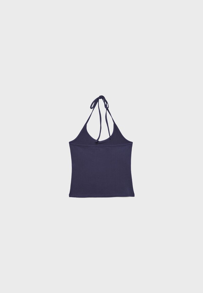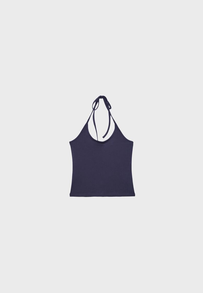 Tettsittende halterneck-top. Har tynne, justerbare bånd og åpen rygg. Tilgjengelig i flere farger.