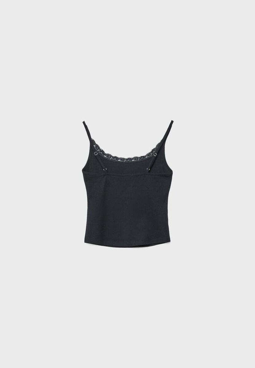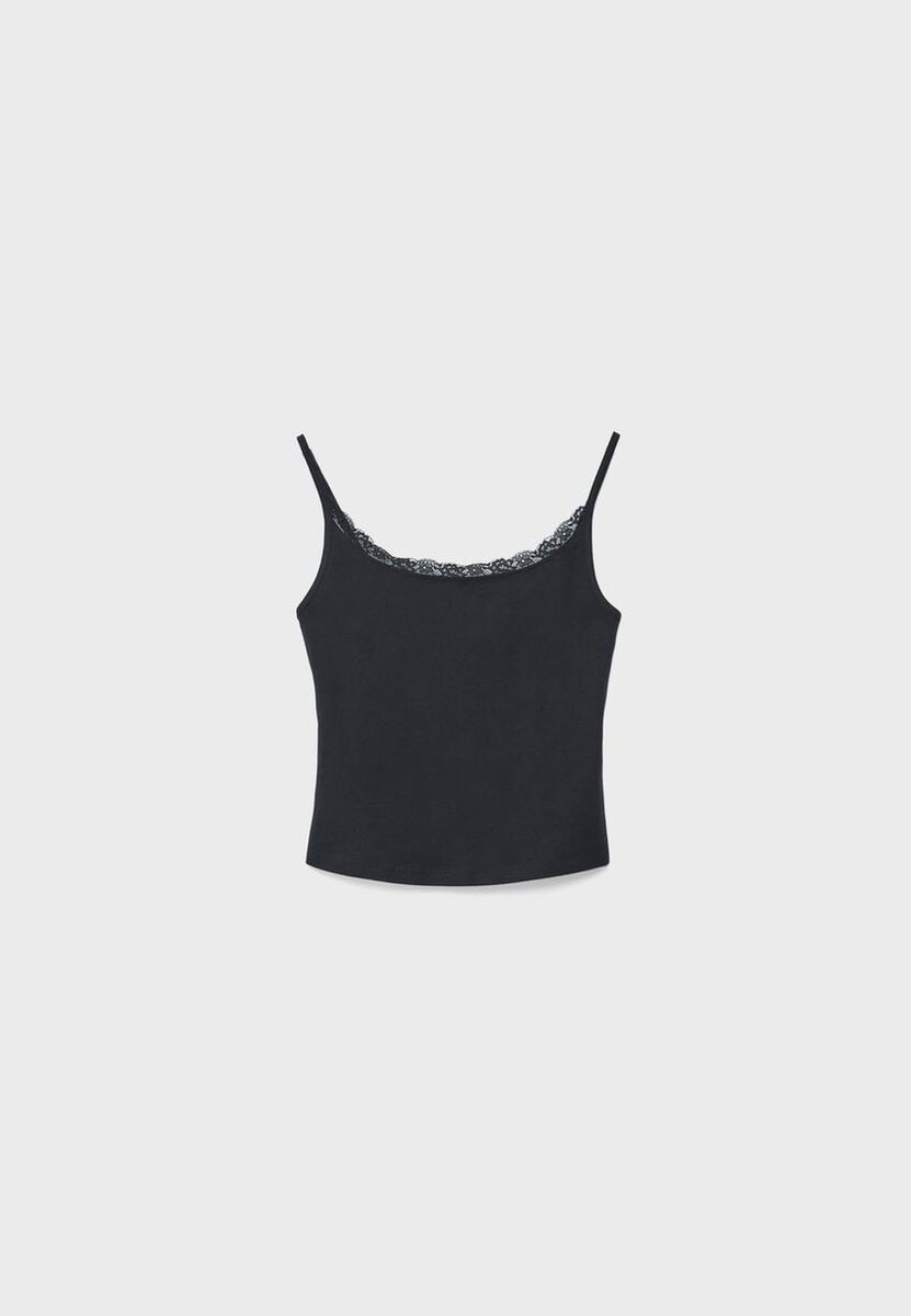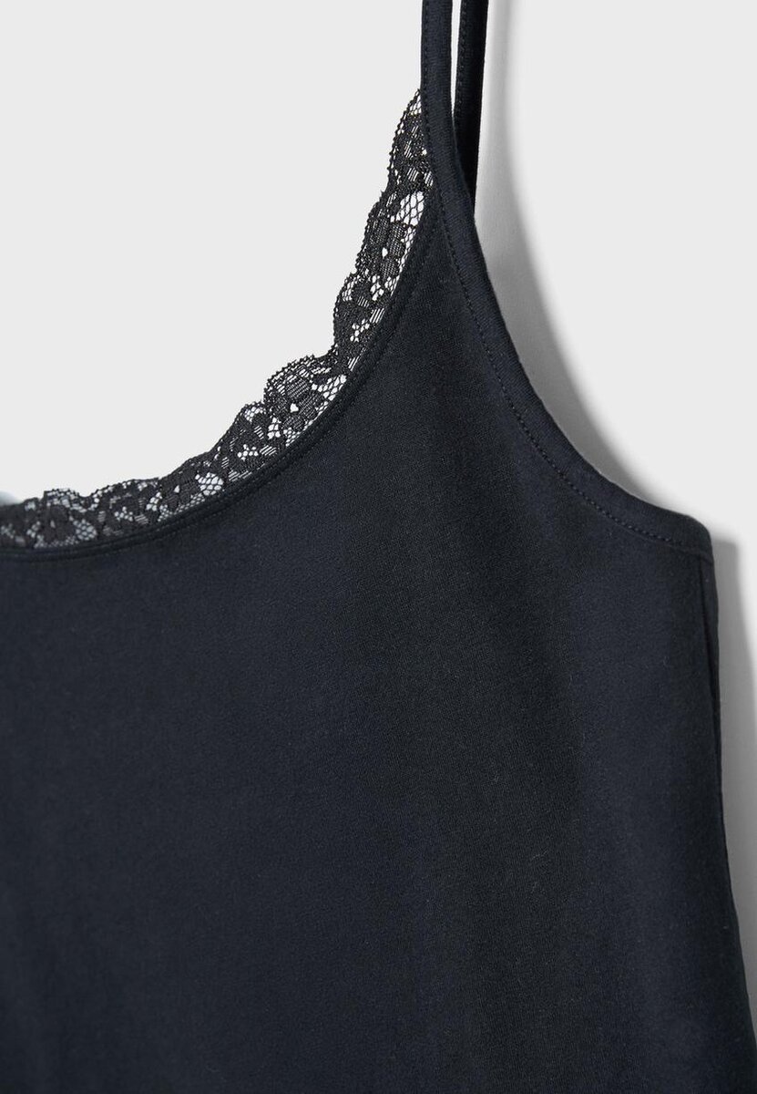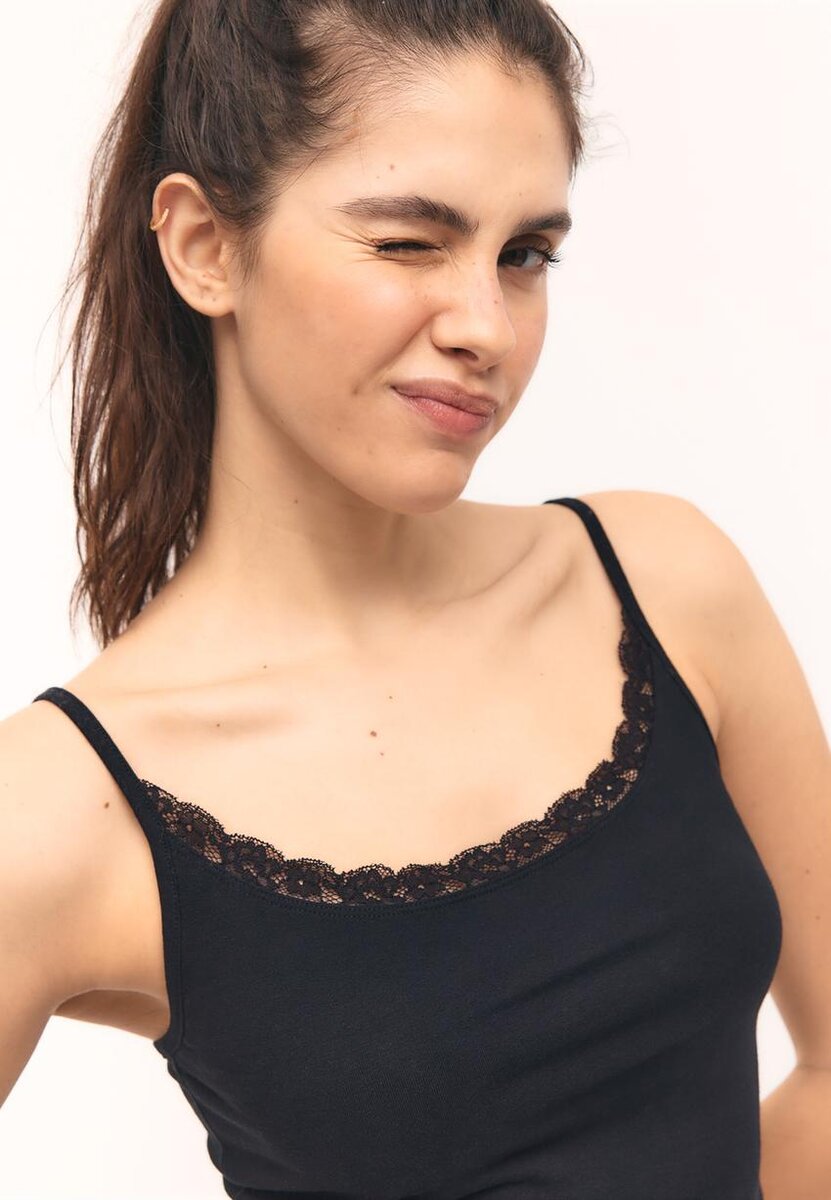 Tettsittende topp med rund hals og tynne stropper, med blonder. Tilgjengelig i ulike farger.