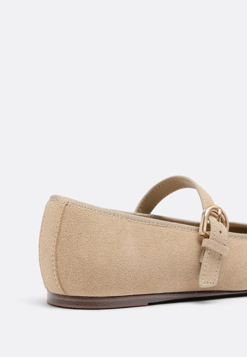 Ballerinasko i skinn med tåkappe. Stroppfeste på vristen med justerbar spenne. Rund hals. Tilgjengelig i brun og beige.