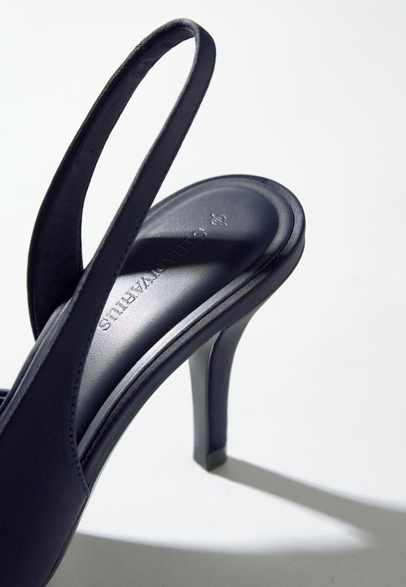 Sko med hæl i satineffekt. Spiss tå. Rem rundt hælen. Tilgjengelig i blått. Hælhøyde: 8 cm