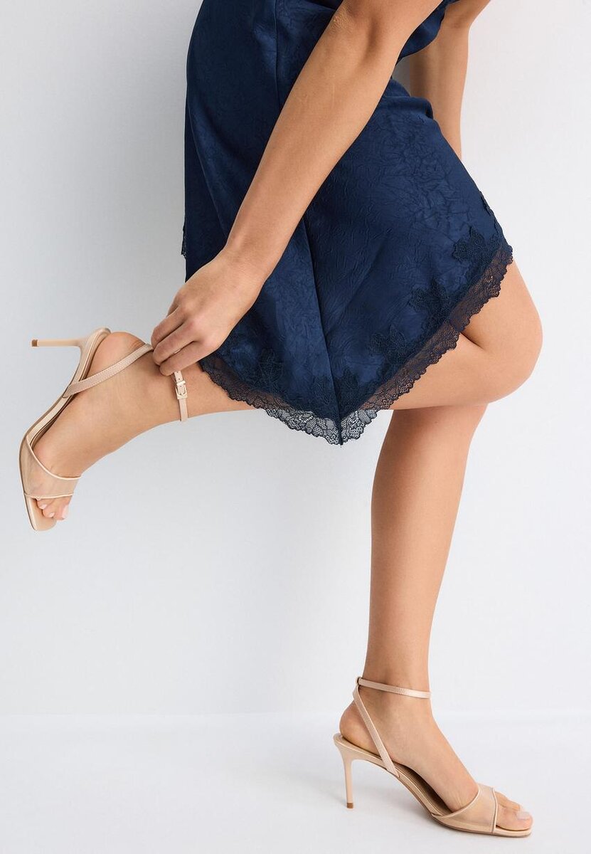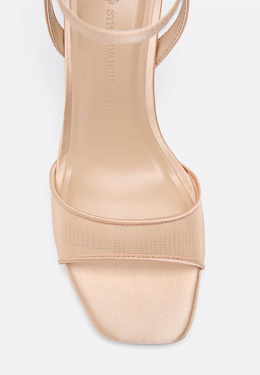 Sandaler med hæl og åpen hæl, satineffekt og meshrem over vristen. Ankelstropp med justerbar spenne. Tilgjengelig i beige. Hælhøyde: 8 cm.