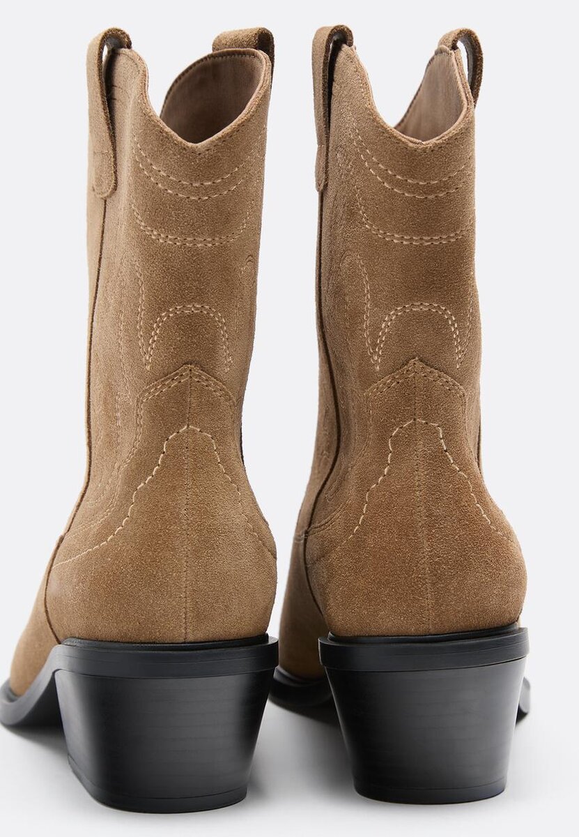 Ankelstøvler i splittet skinn i cowboy-stil. Trekkfliker på skaftet og sømmer. Tilgjengelig i beige. Hælhøyde 5 cm.