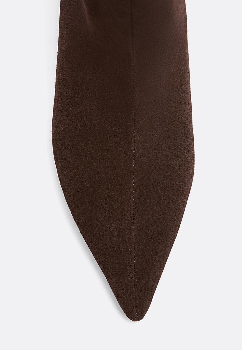 Ankelstøvler med stilett. Materiale i splittet skinn. Spiss tå. Tilgjengelig i brun. Hælhøyde 4 cm.