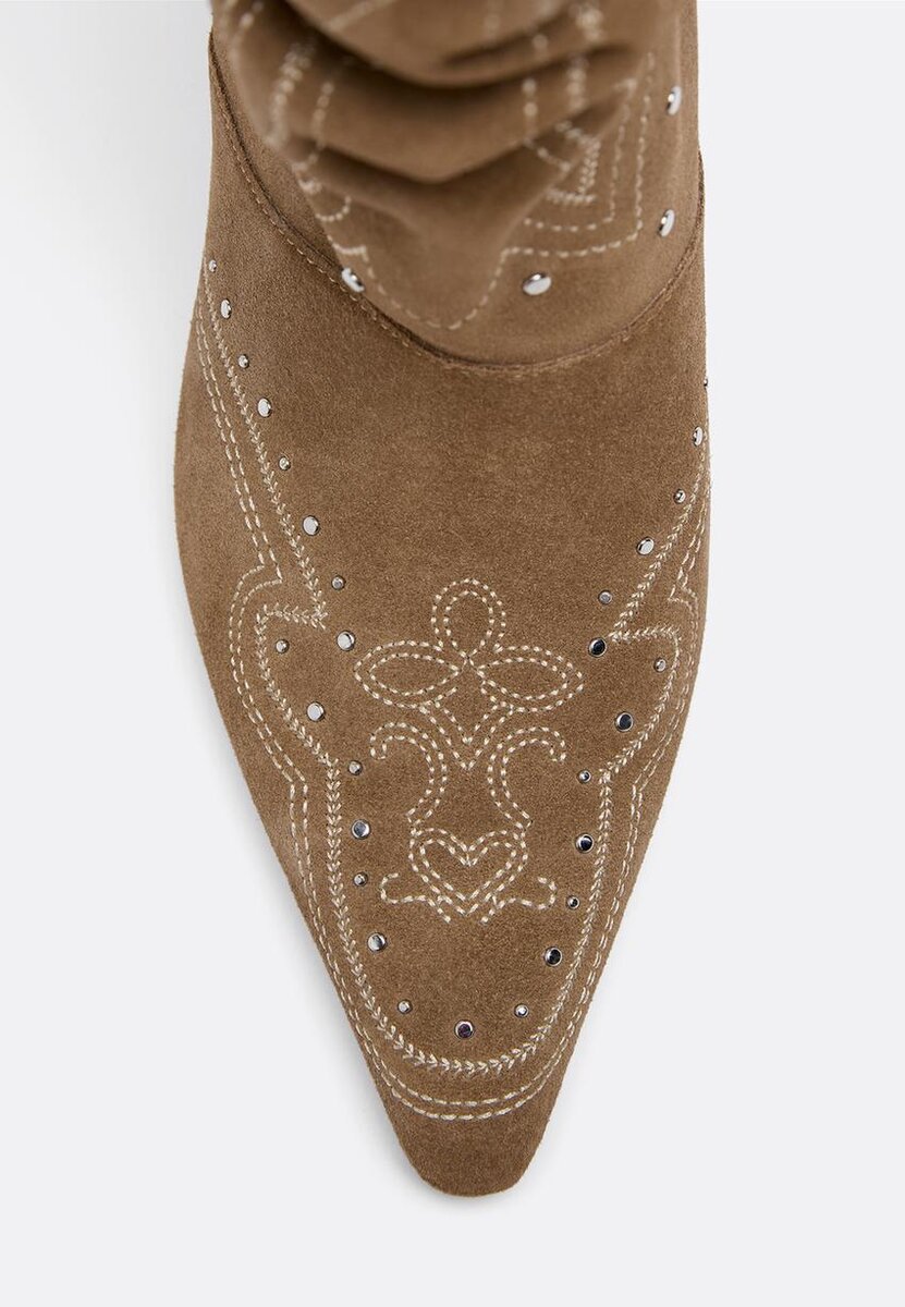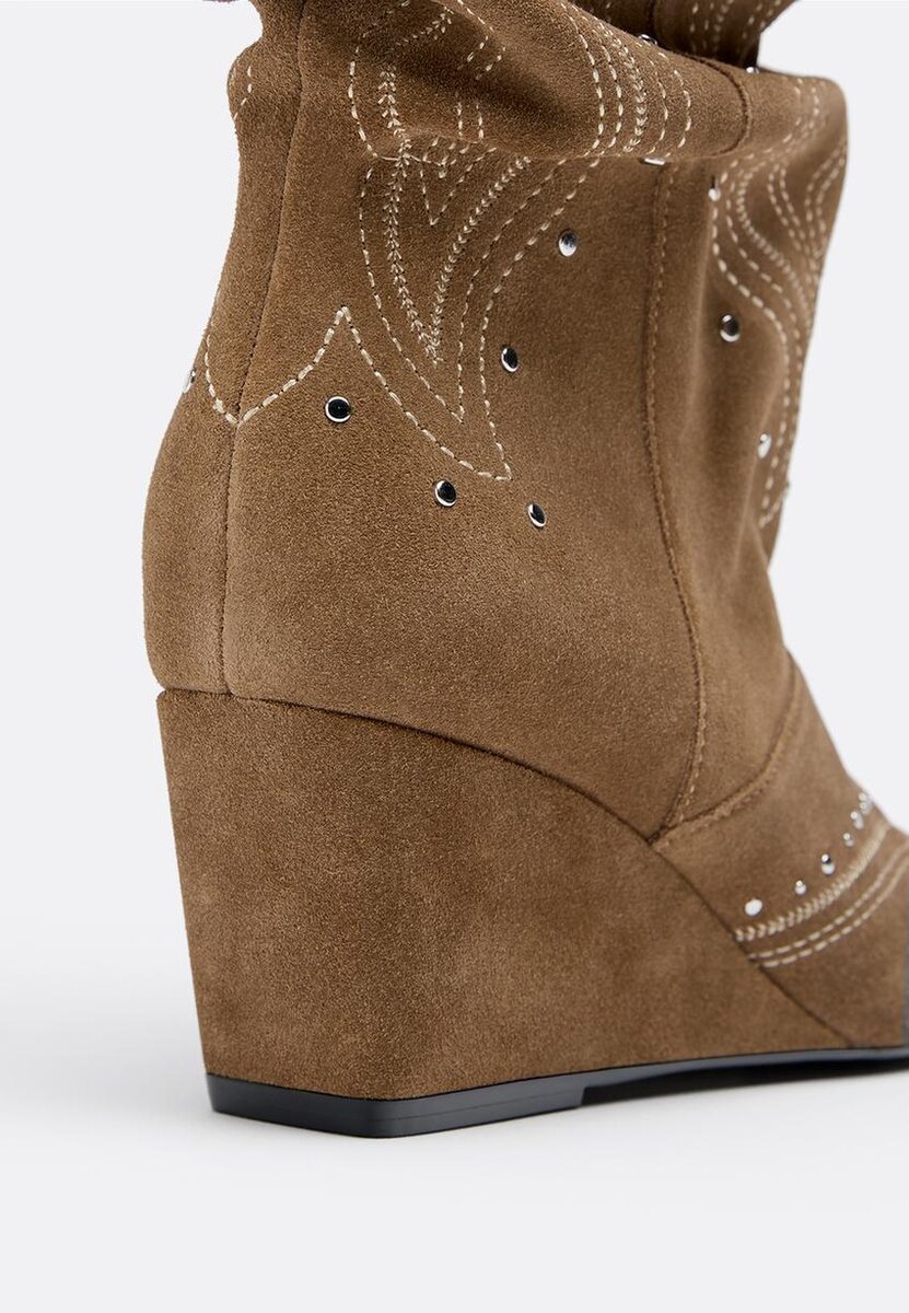 Støvler i skinn med kilehæl. Slouchy skaft. Nitter og broderte mønstre rundt støvlene. Spiss tå. Tilgjengelig i beige. Hælhøyde: 8 cm
