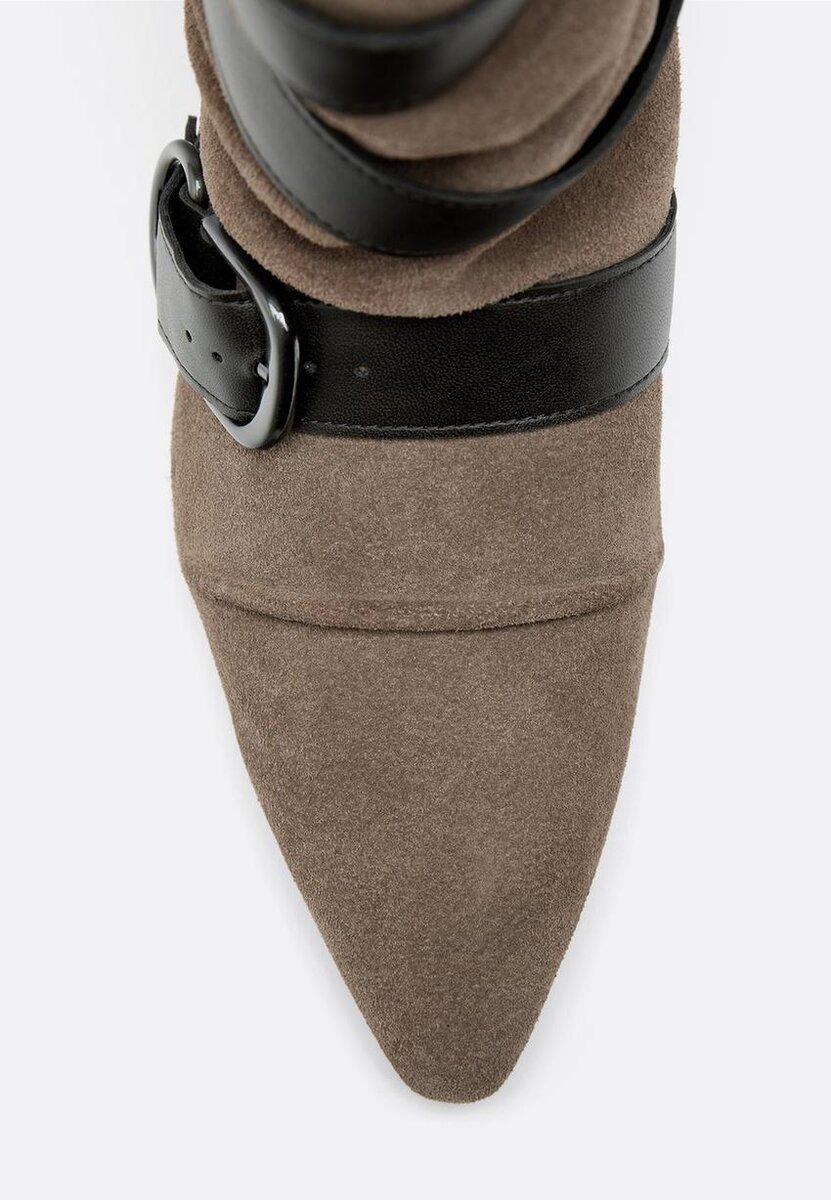 Skinnstøvletter med lav hæl, Slouchy skaft og belter rundt. Tilgjengelig i beige. Hælhøyde: 3 cm.