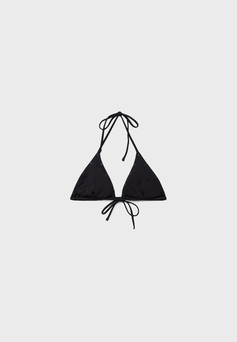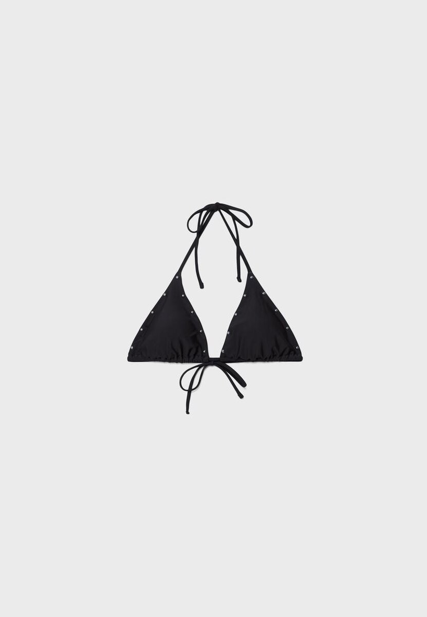 Justerbar triangel-bikinitopp med båndlukking i nakken og på ryggen. Med nittedetaljer. Tilgjengelig i flere farger.