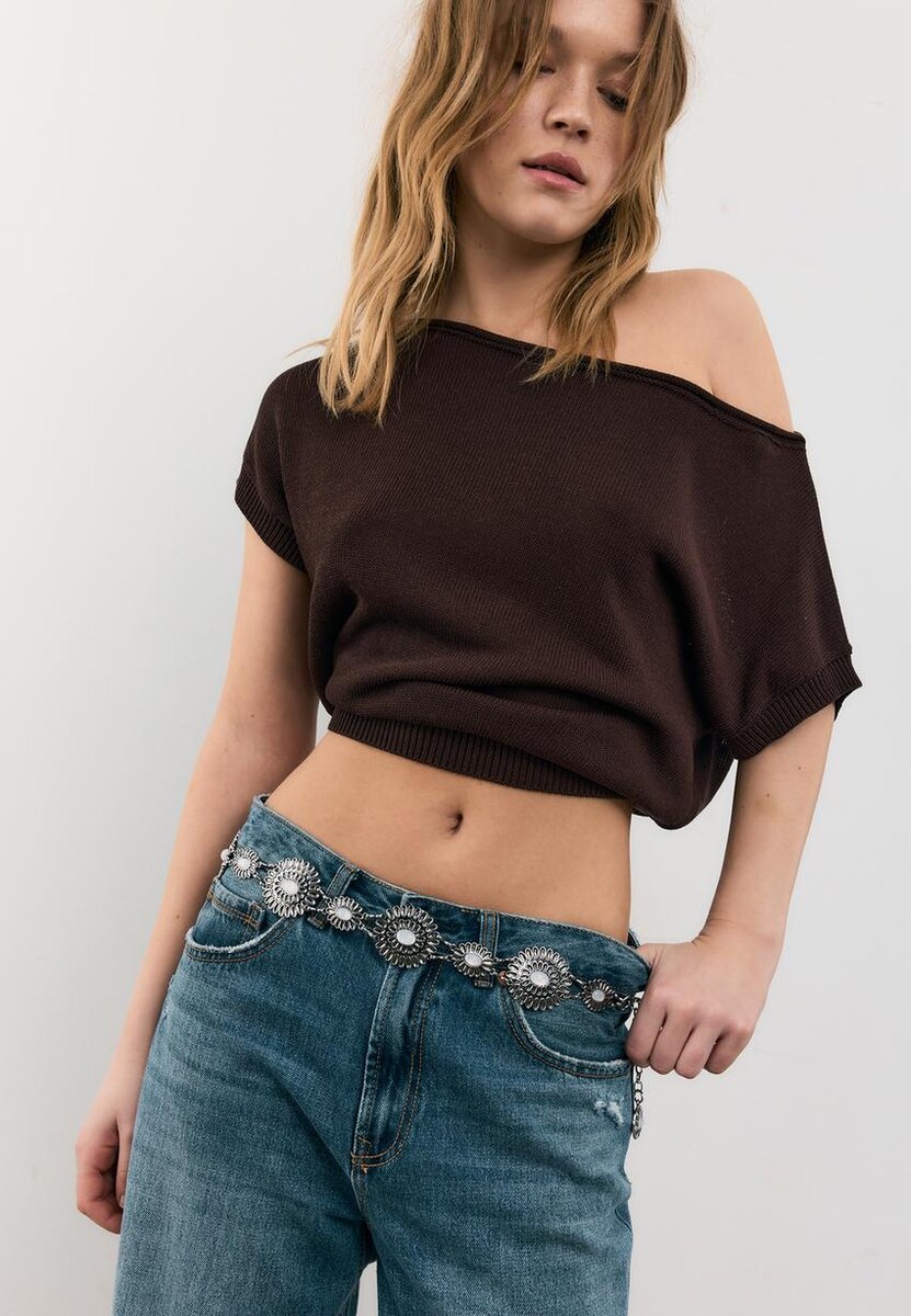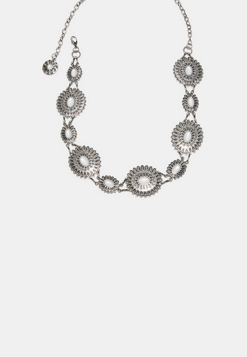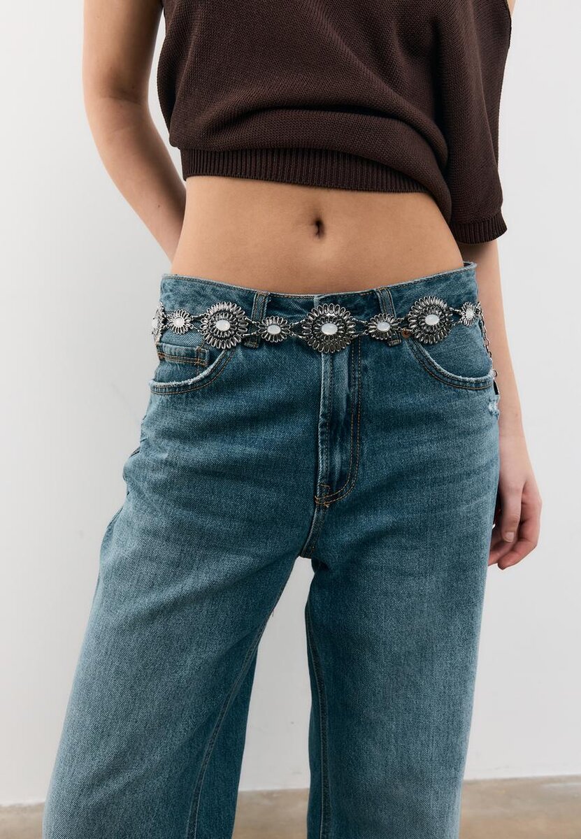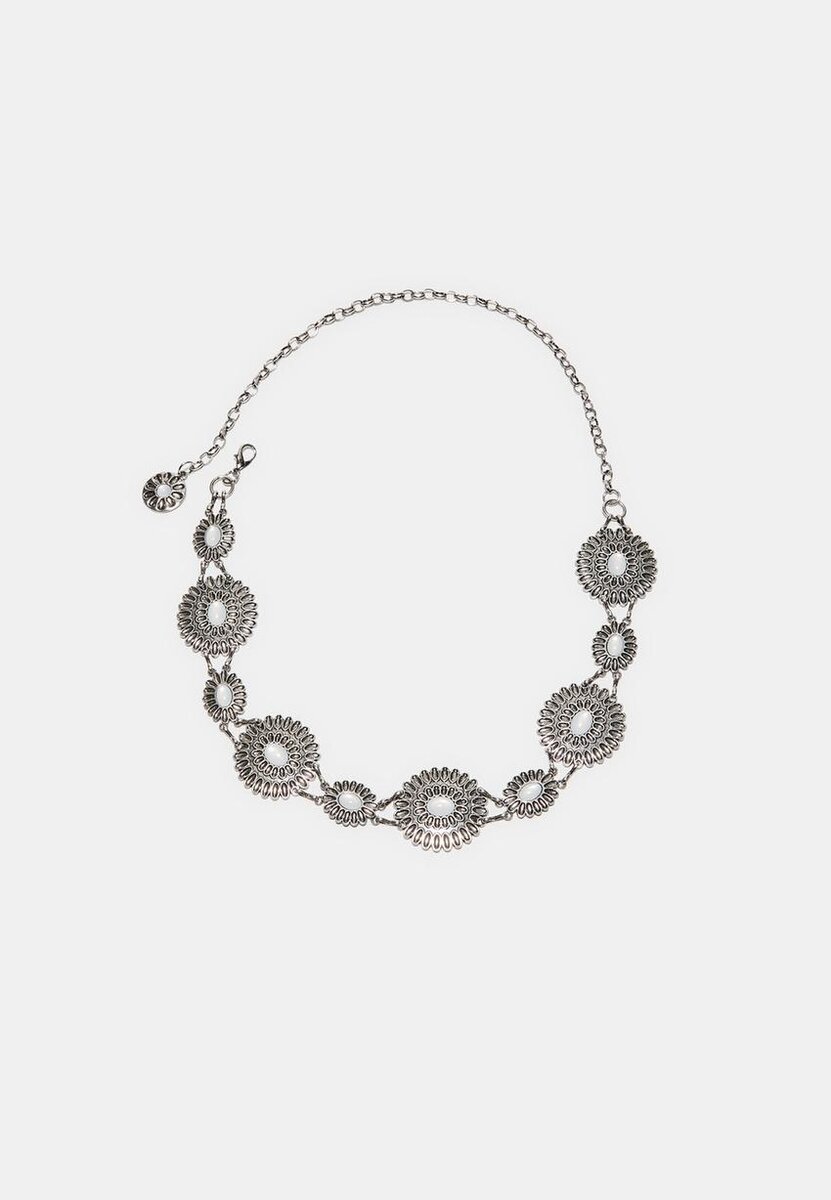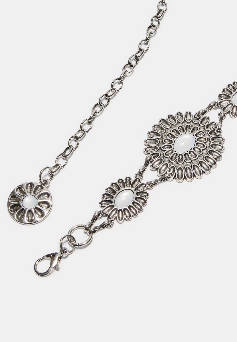 Kjede-belte bestående av metallblomsterlenker. Delene har en oval detalj i midten. Justerbar karabinkrok med kjede.