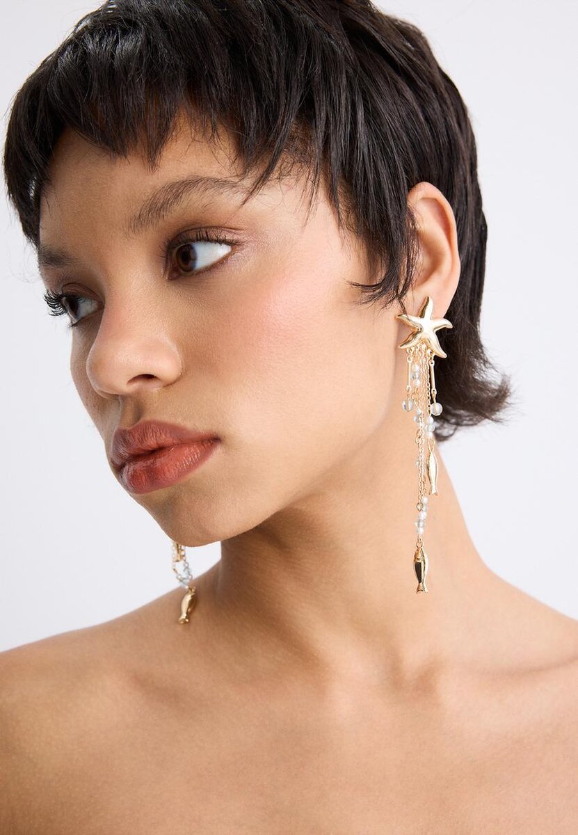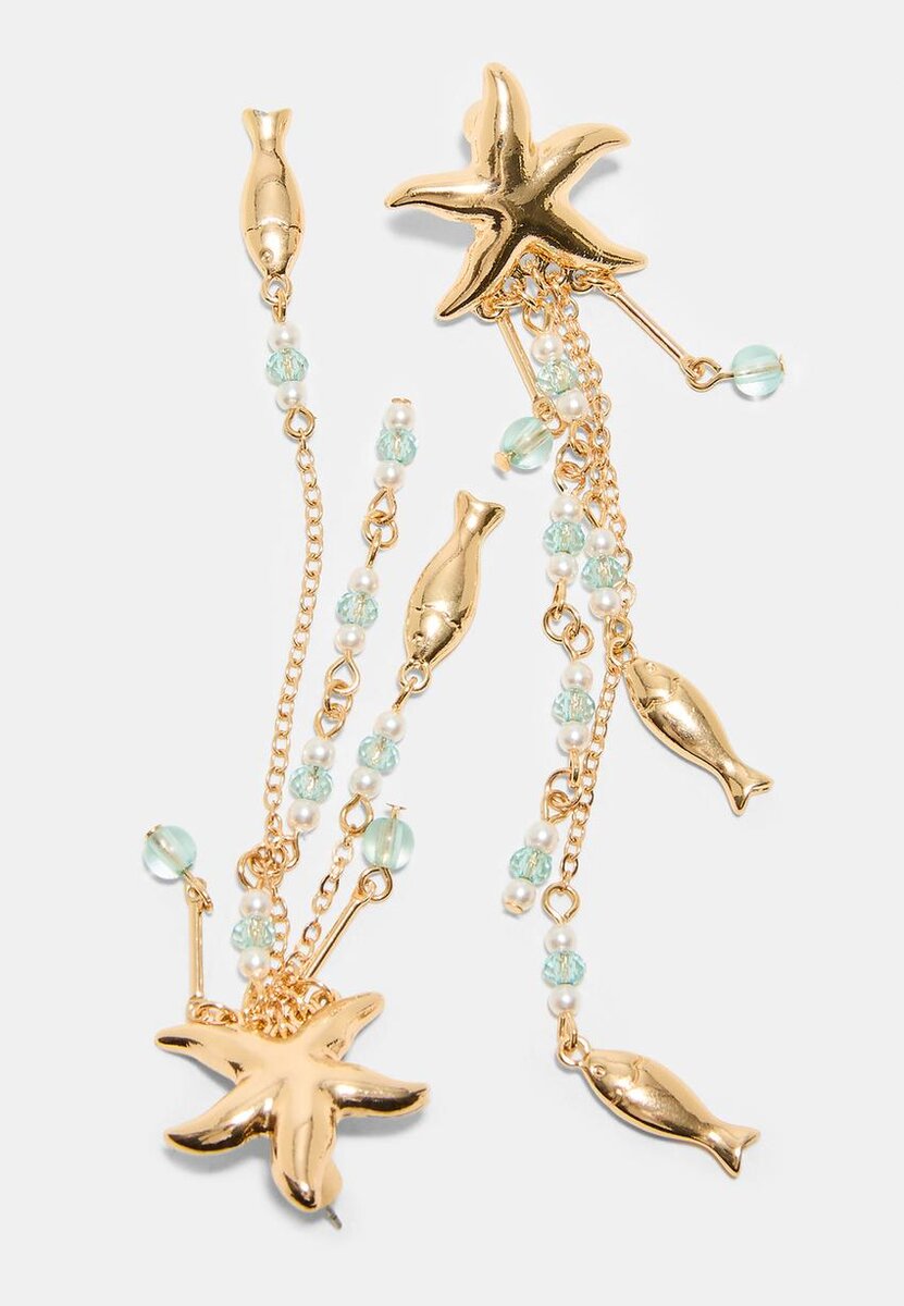Lange ørestikker med stjernedetalj og et kaskadeformet design av kjeder med perler og fiskemotiver.