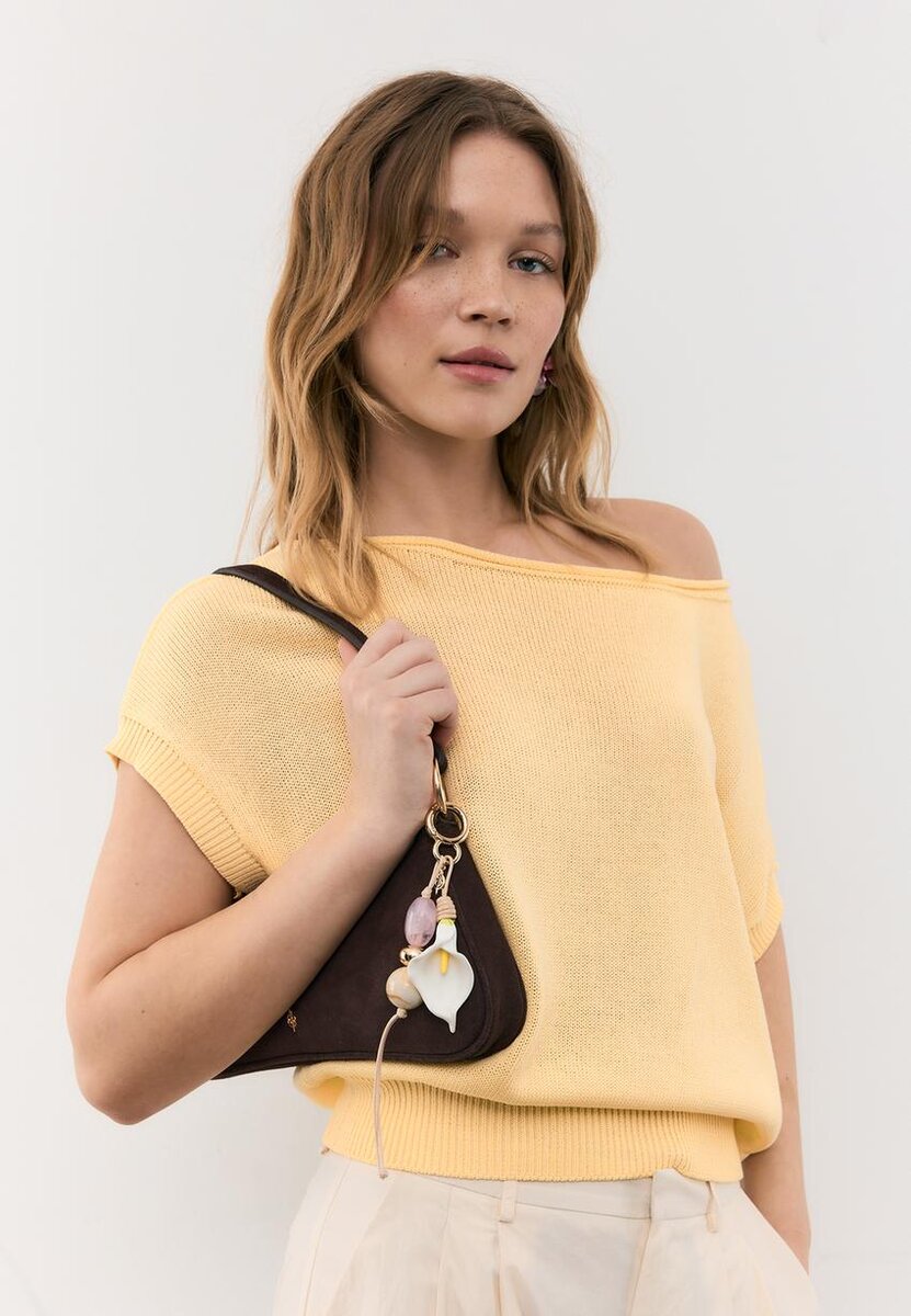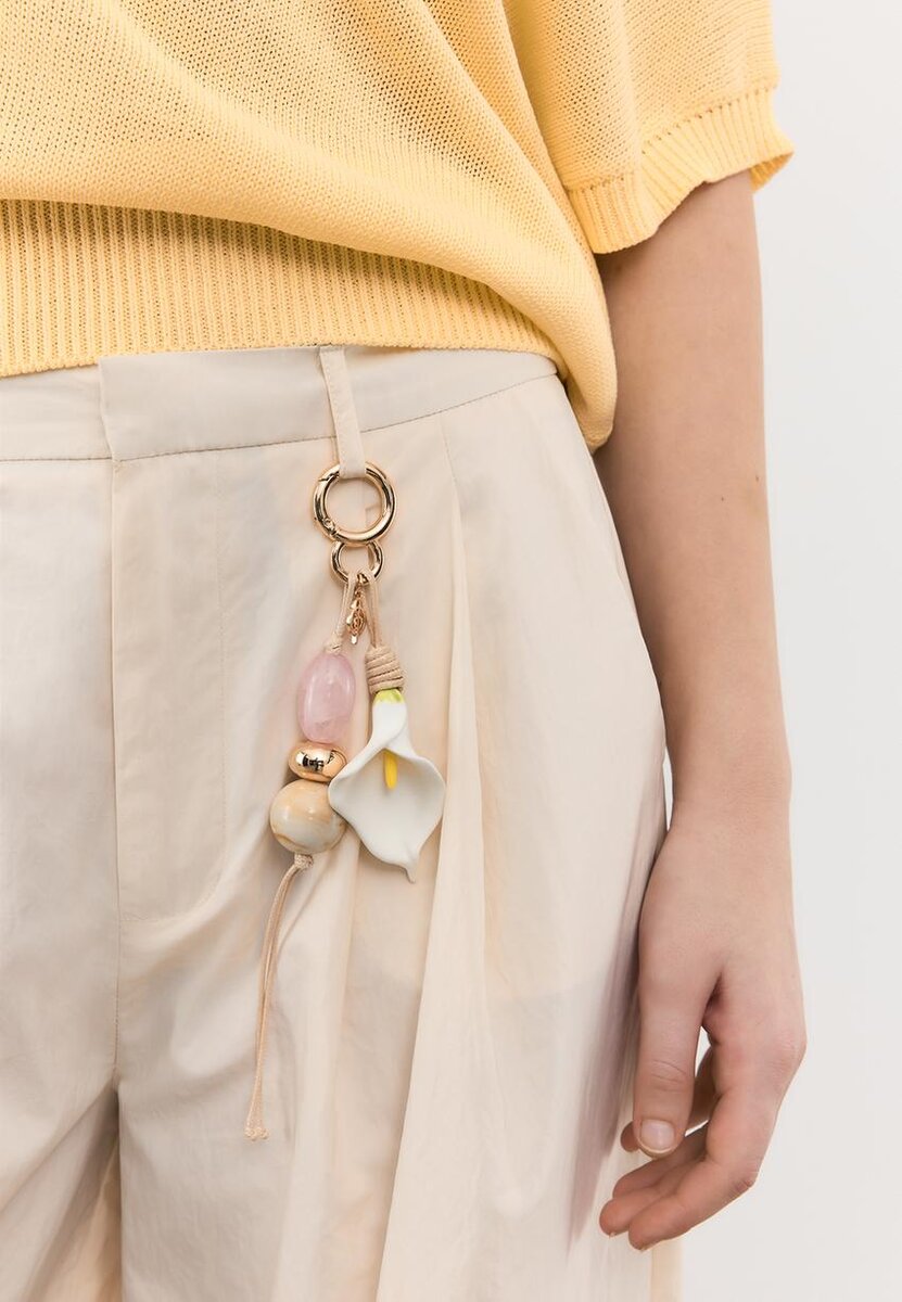 Nøkkelring med en rund metallring. Toppen av tilbehøret har et hovedelement formet som en calla-lilje, flere harpiksperler i ulike former og en strukturert metallperle. Det henger også fine knyttede snorer fra den.