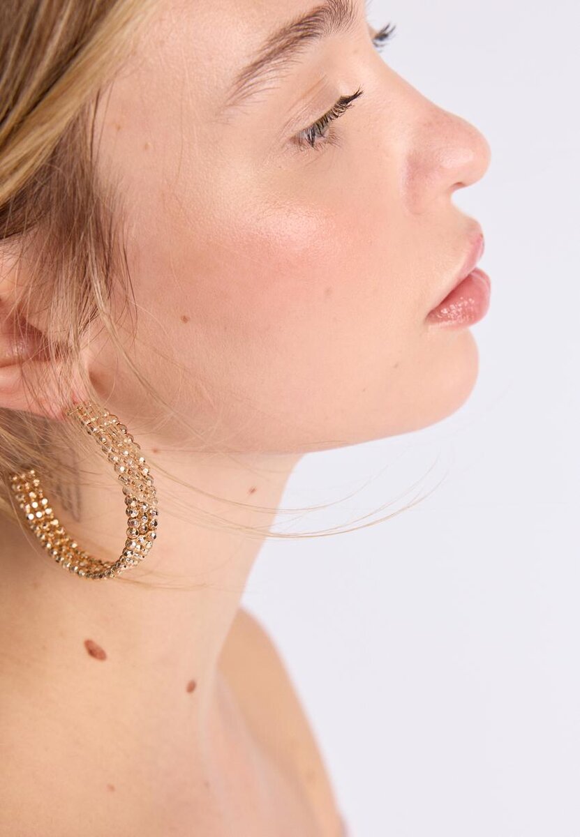 Stive hoop-øreringer. Overflaten på ringen er dekorert med små pregede perler langs hele smykket. Trykknapp-lås.