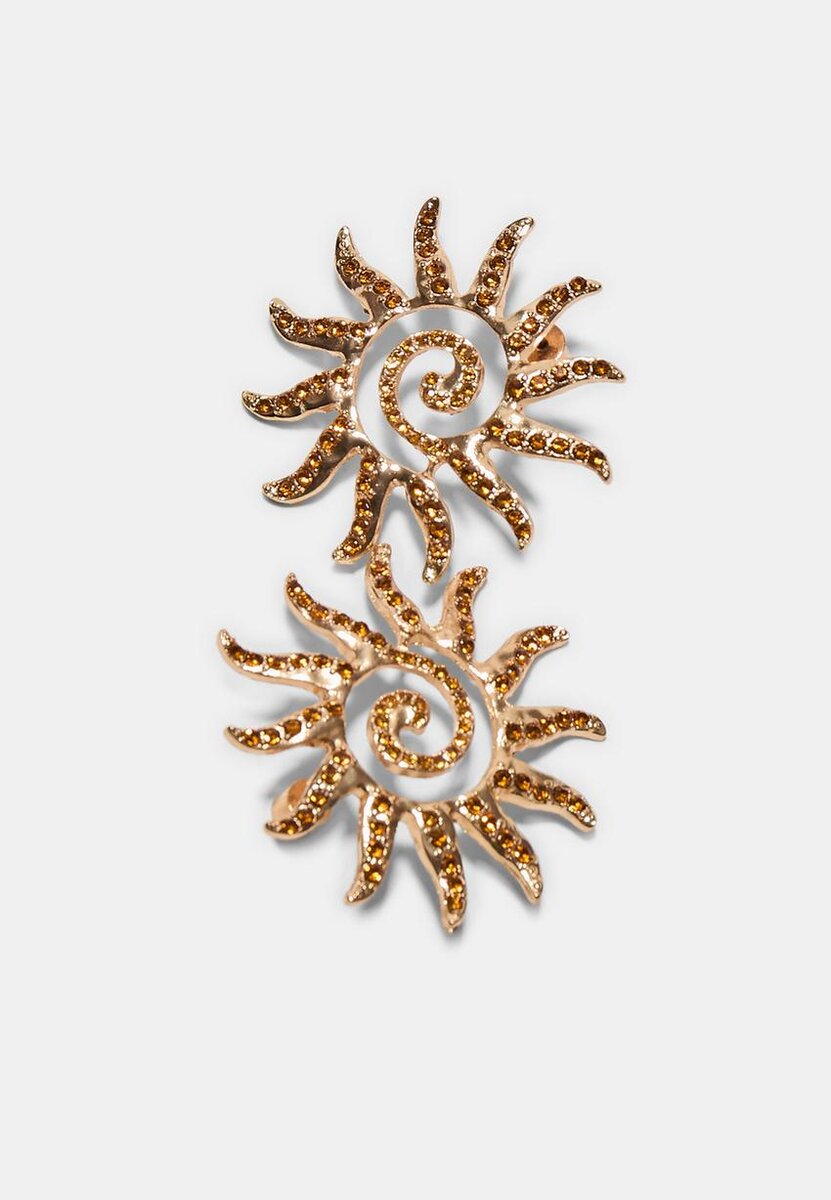 Små øreringer med solformet design. Teksturert topp med stråler som utgår fra et spiralformet senter. Strassapplikasjoner i sentrum og på strålene. Trykknapp-lukking.