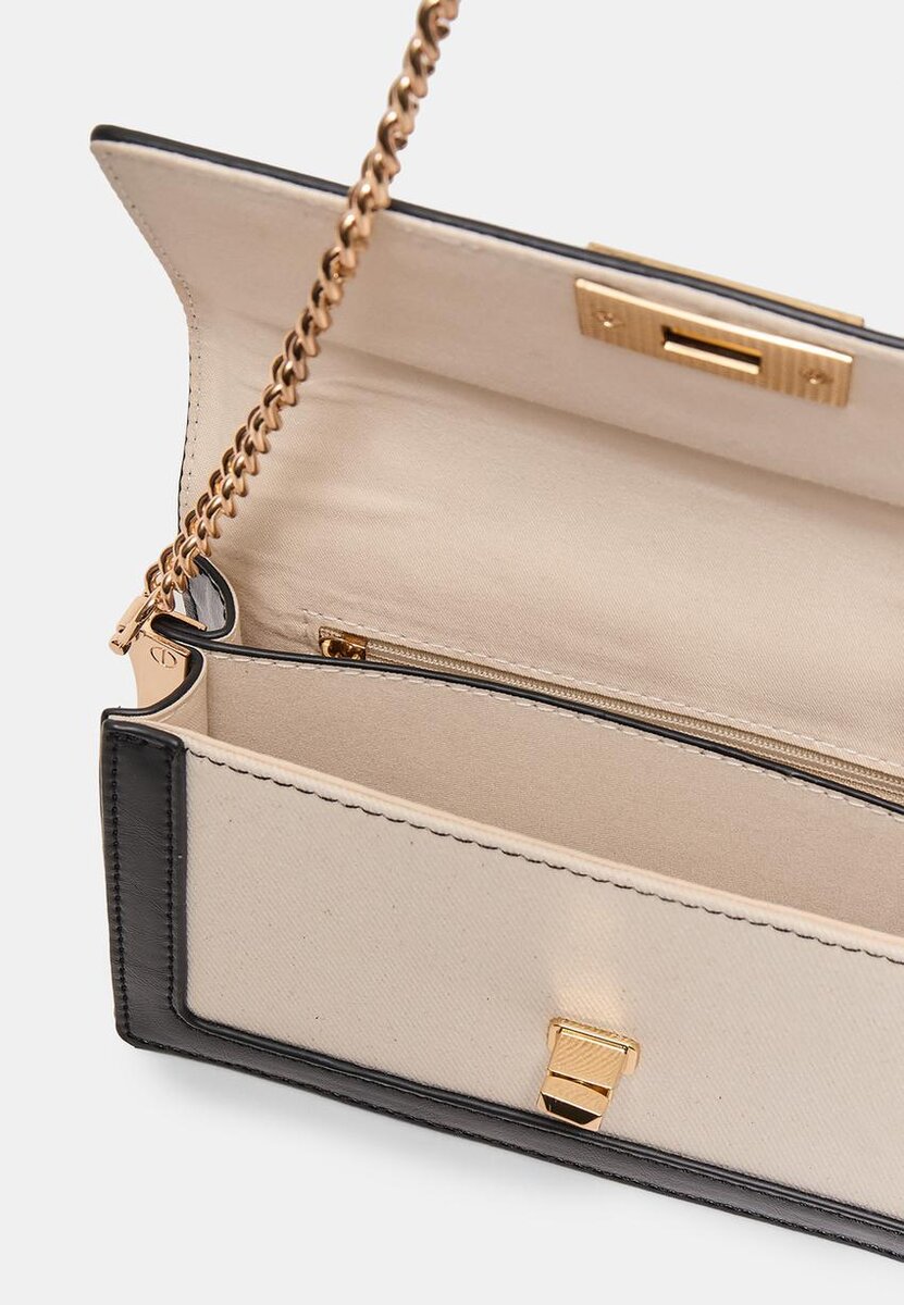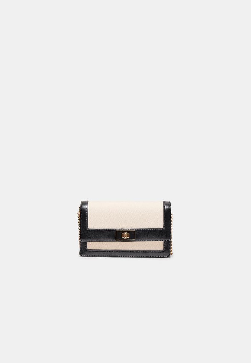 Kontrastveske med kryssrem. Metallspenne på klaffen. Skulderrem i kjede. Laget av hovedstoff i bomull. Tilgjengelig i flere farger.
