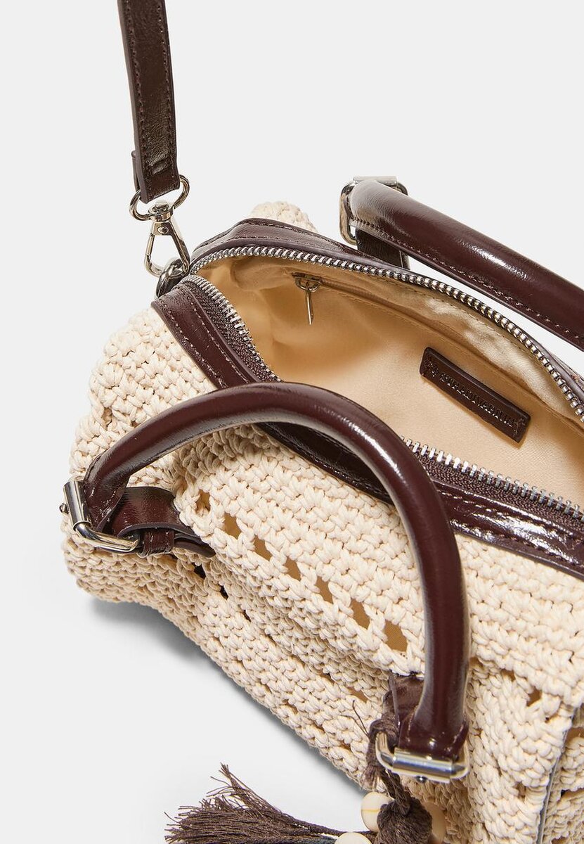 Heklet totebag i bomull, med doble håndtak og avtakbar skulderrem. Glidelåslukking. Pyntet med en dusk og skjelldetalj. Tilgjengelig i flere farger.